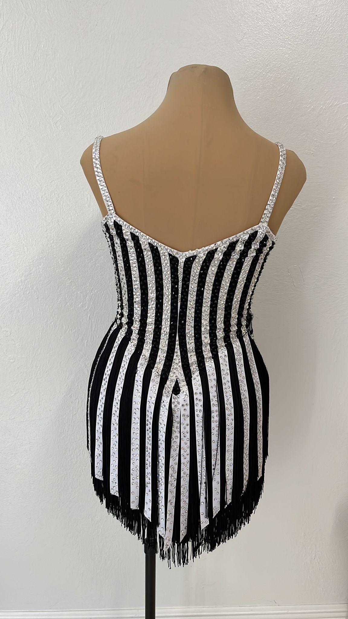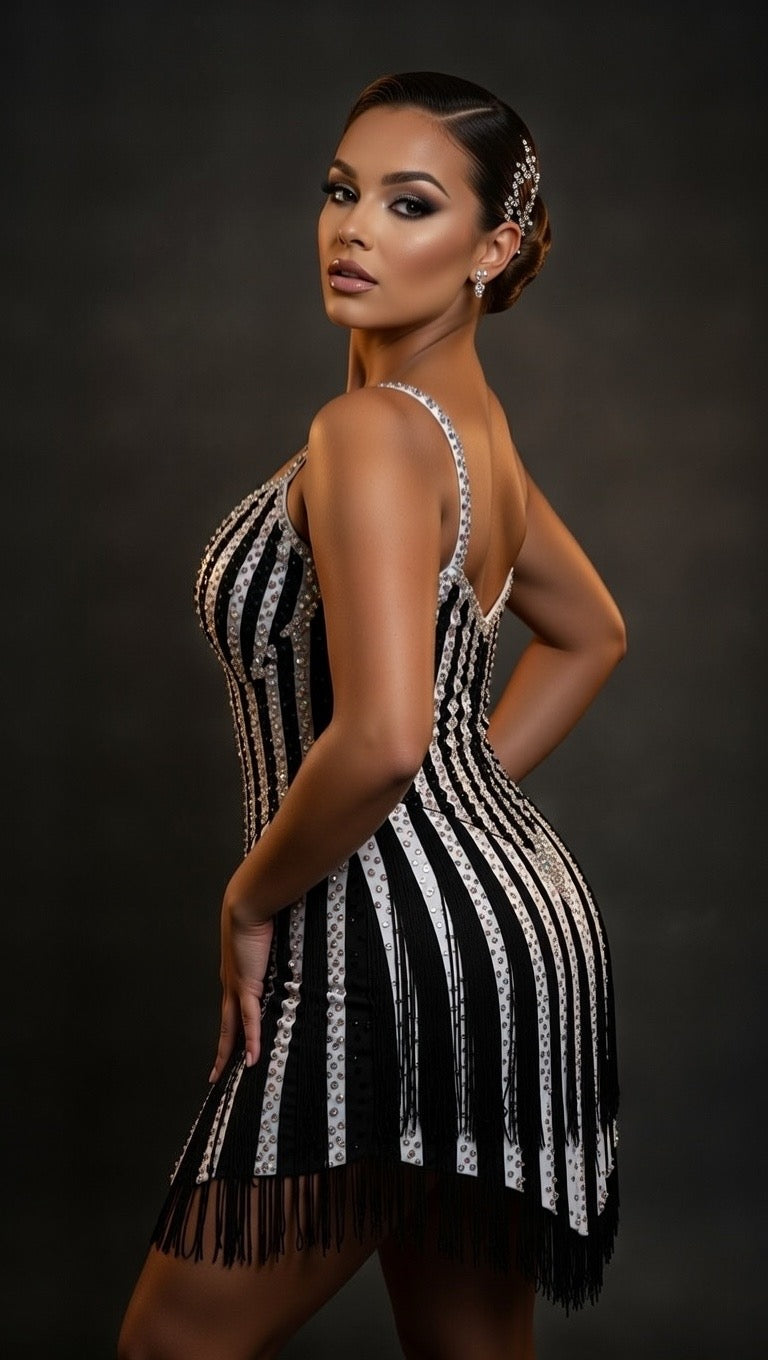 Fabric & Embellishments: Crafted with premium materials and adorned with rhinestone details that catch the light beautifully, this gown combines classic ballroom aesthetics with the vibrant energy of Latin dance. The intricate embellishments enhance the gown's visual impact on the dance floor.