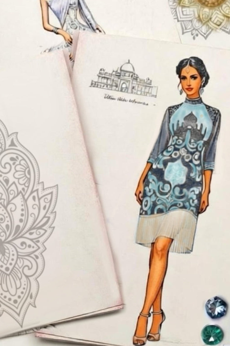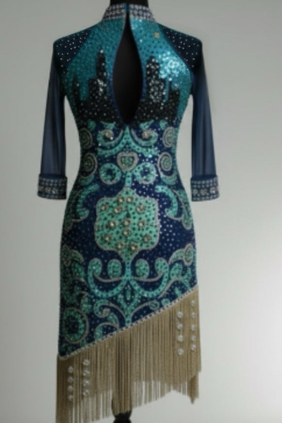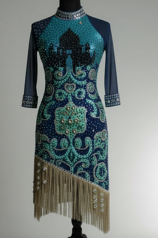 Inspired by the majestic architecture of India’s iconic temples, this rhythm ballroom gown from The Indian Palace Collection features a deep navy and turquoise foundation with a striking temple silhouette and intricate emerald green and gold swirls mimicking ornate motifs. The high-neck and mid-length sleeves shimmer with crystals, while the daring asymmetric hemline fringed in gold sways with hypnotic energy for any rhythm style. A portion of proceeds supports orphanages in India. You Dream, WE Design—where mythic elegance flows in every motion.