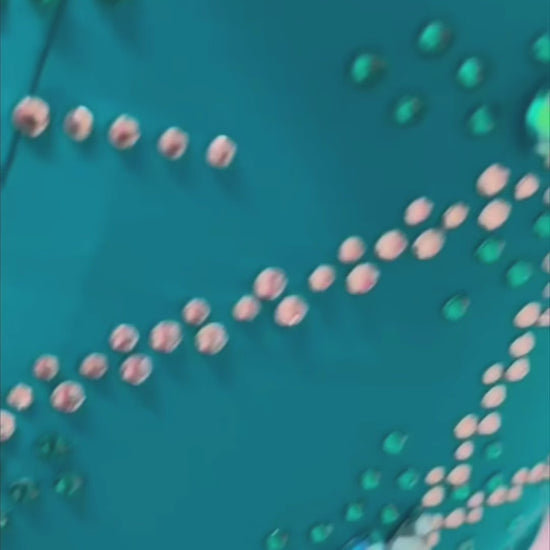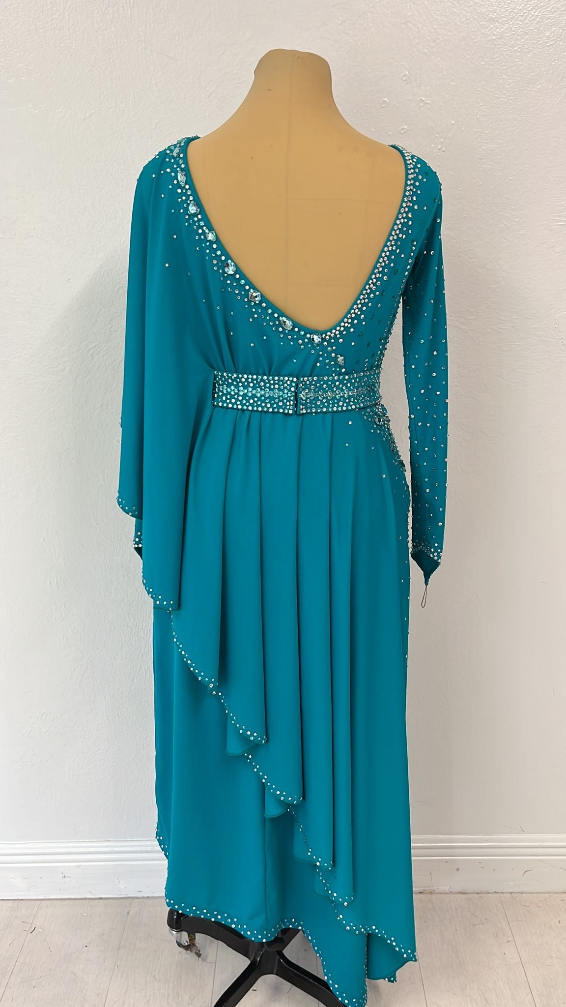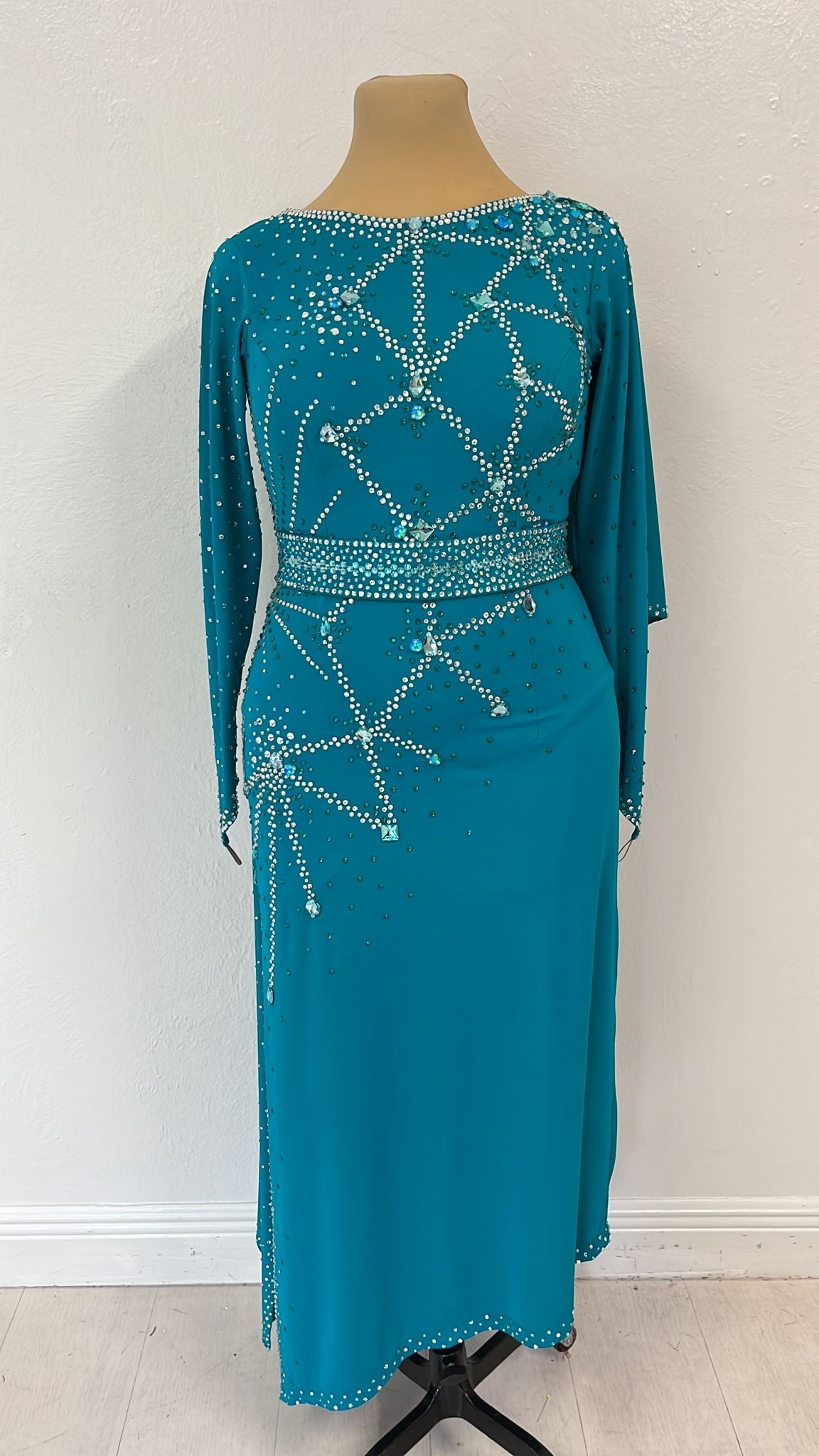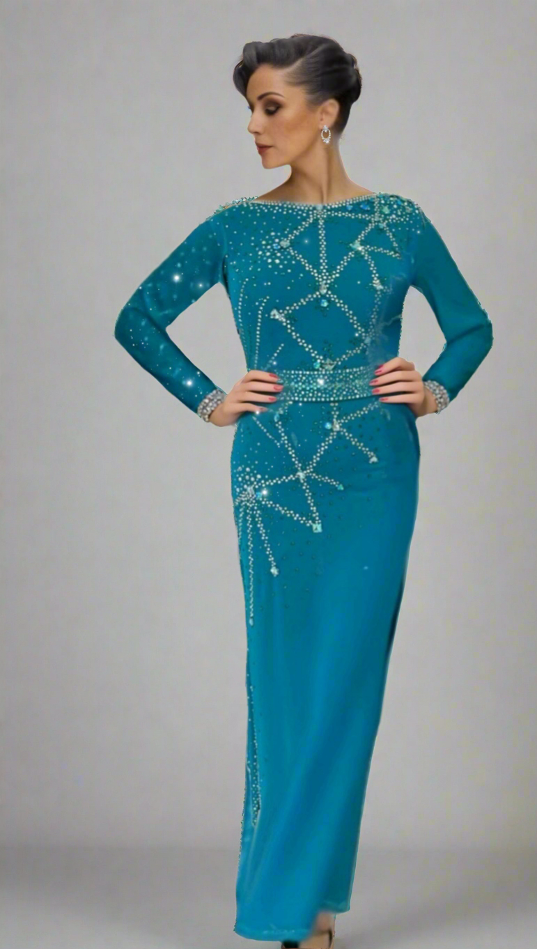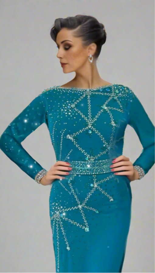 Blue Constellation is crafted for the passionate rhythms of Latin dances like Samba and Cha-Cha. This striking long, lean Latin gown features a vibrant teal hue, adorned with intricate silver and crystal embellishments that form a celestial pattern across the bodice and flowing sleeves. Made from lightweight, stretchable fabric, it hugs the figure for a sleek silhouette while allowing dynamic movement, with a subtle high-low hem adding a modern flair. The dazzling star-like detailing and elegant design make Blue Constellation perfect for dancers aiming to shine with intensity and grace on the dance floor. Twirl with celestial elegance in Blue Constellation.