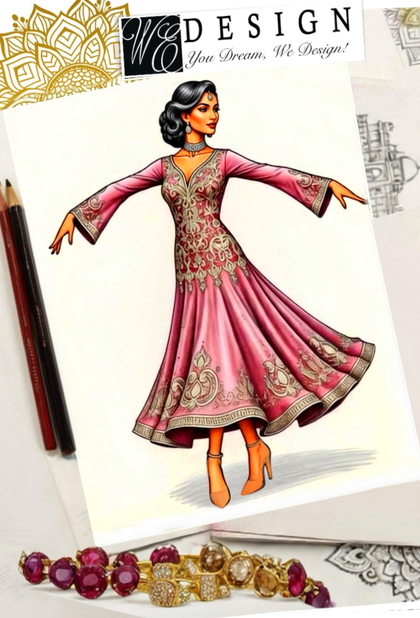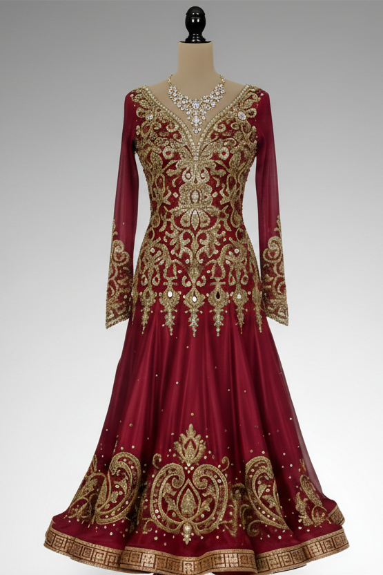 This American Smooth gown from The Indian Palace Collection embodies regal opulence with its deep crimson silk base, adorned in intricate gold embroidery featuring paisley motifs and swirling patterns inspired by Indian palace artistry. The V-neckline and long sleeves add elegant coverage, while the flared skirt with subtle beading ensures fluid movement and dramatic flow on the dance floor. A portion of proceeds supports orphanages in India. You Dream, WE Design—where heritage twirls in every step.