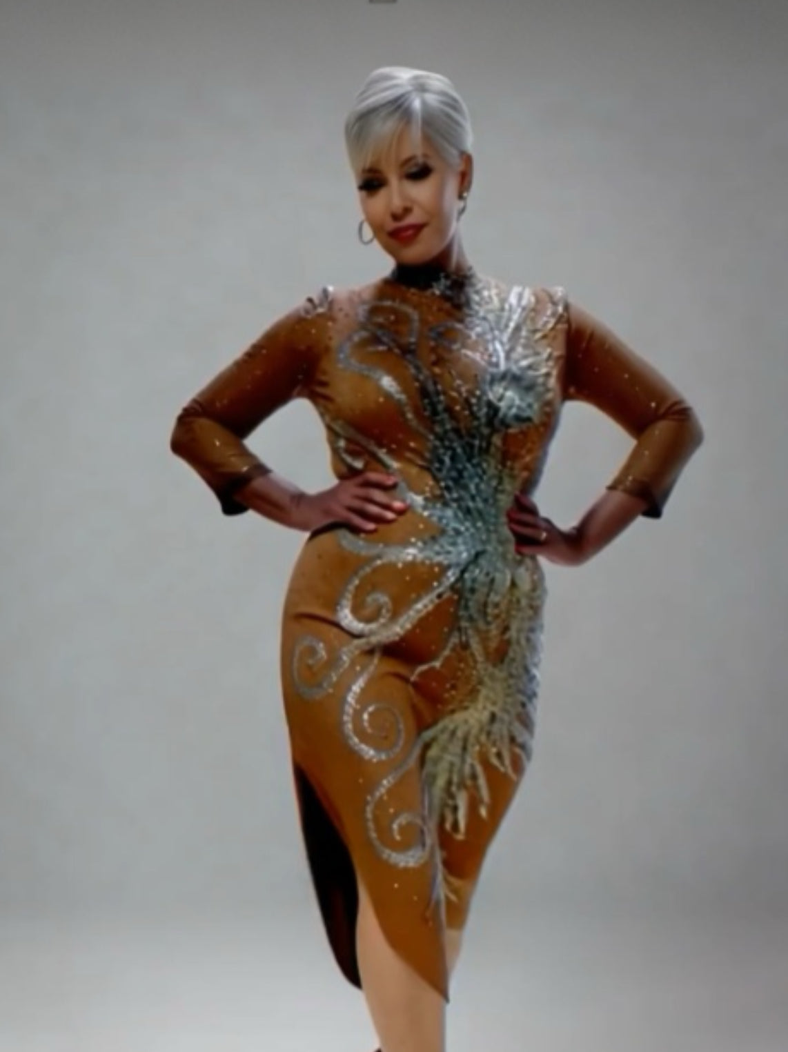 The Crescent Moon gown radiates the enchanting allure of an autumn night, its rich bronze fabric adorned with shimmering silver embellishments that mirror the glow of a harvest moon. The elegant, asymmetrical design flows with grace, capturing the crisp elegance of falling leaves, while the intricate detailing evokes the mystique of a starry fall sky. Perfect for twirling through the season, this gown transforms every movement into a celebration of autumnβs magical twilight.