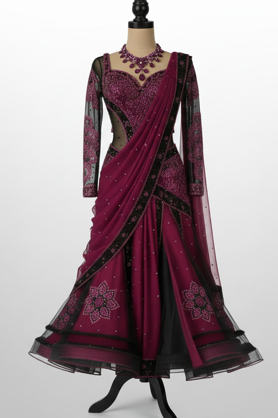 This American Smooth gown from The Indian Palace Collection channels the mystique of Indian royal jewels with its rich magenta silk base, accented by black mesh panels and intricate crystal embroidery forming lotus-inspired motifs. The sweetheart neckline with ruby choker detail and long illusion sleeves offer elegant coverage, while the open V-back and layered tulle skirt with subtle slit provide graceful flow and sparkle for waltz movements. A portion of proceeds supports orphanages in India. You Dream, WE Design—where regal hues sing in every twirl.