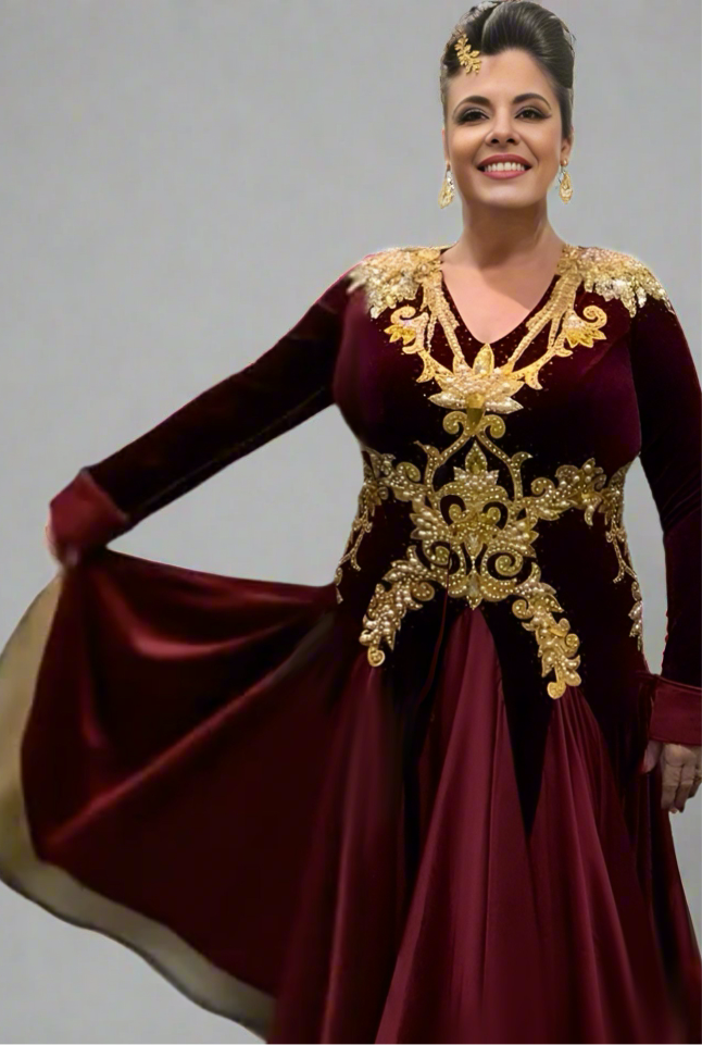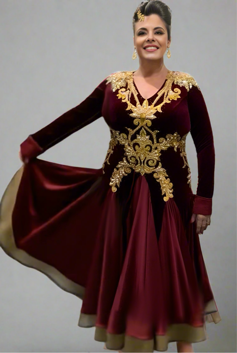 Make a statement on the dance floor with this stunning Coral gown, aptly named "Brilliant." Its off-the-shoulder design not only enhances your shape but also adds a touch of elegance to your ballroom style. The stoned trim beautifully emphasizes and minimizes the waistline, creating a flattering silhouette.
