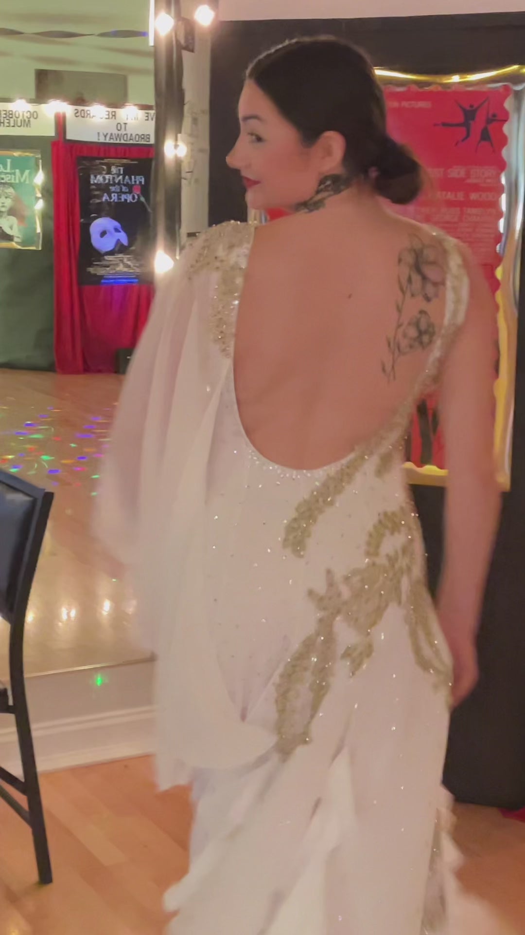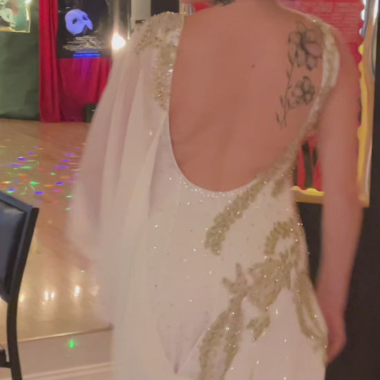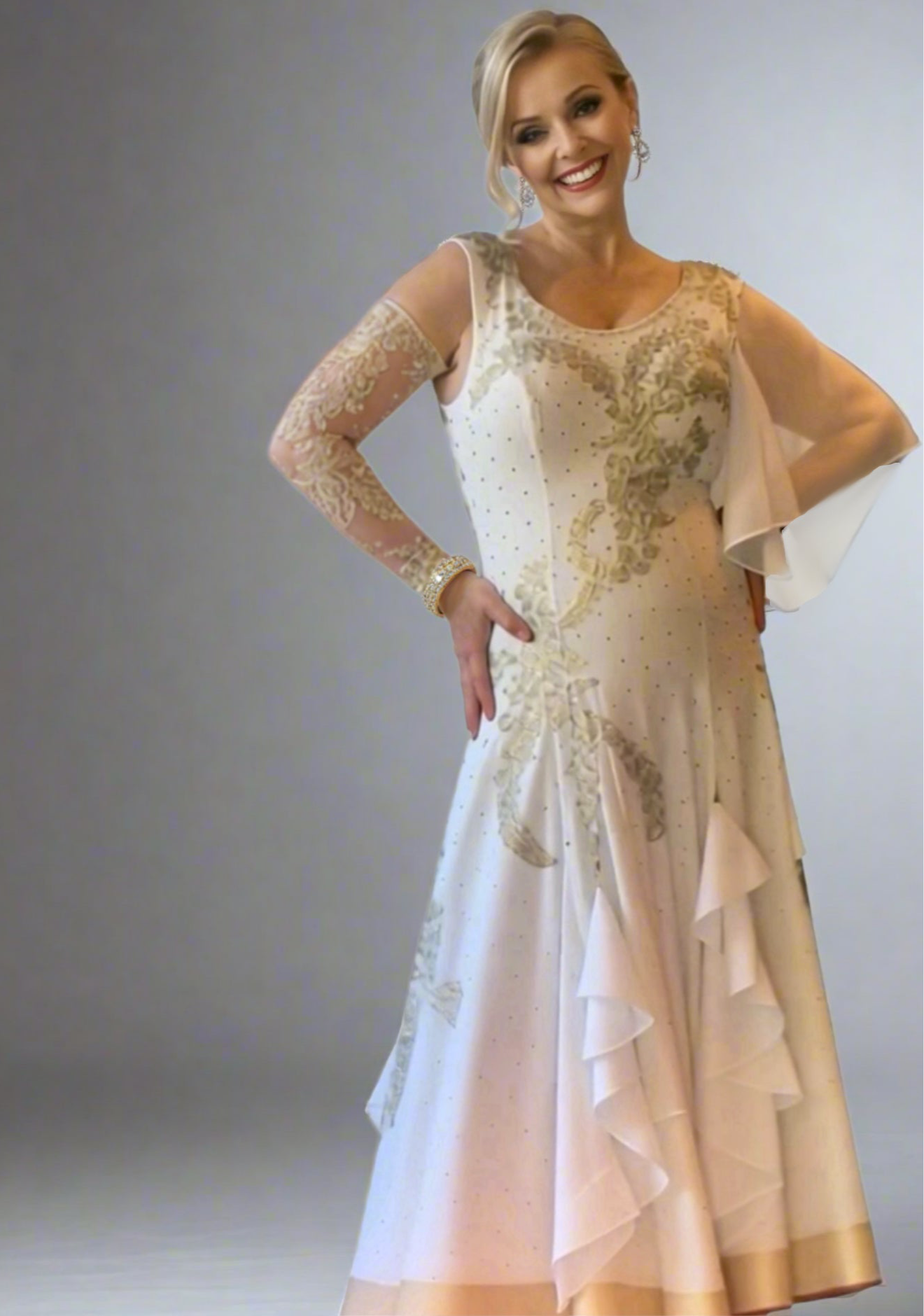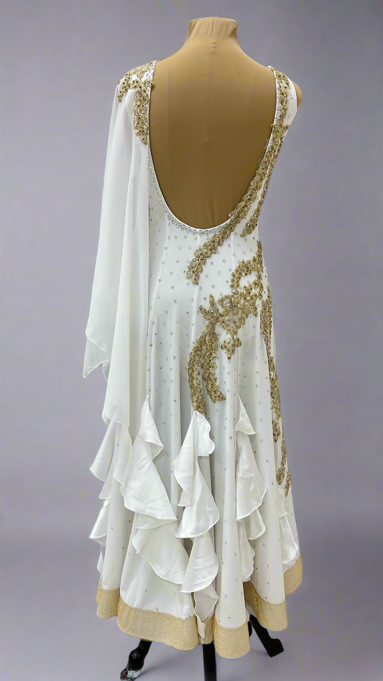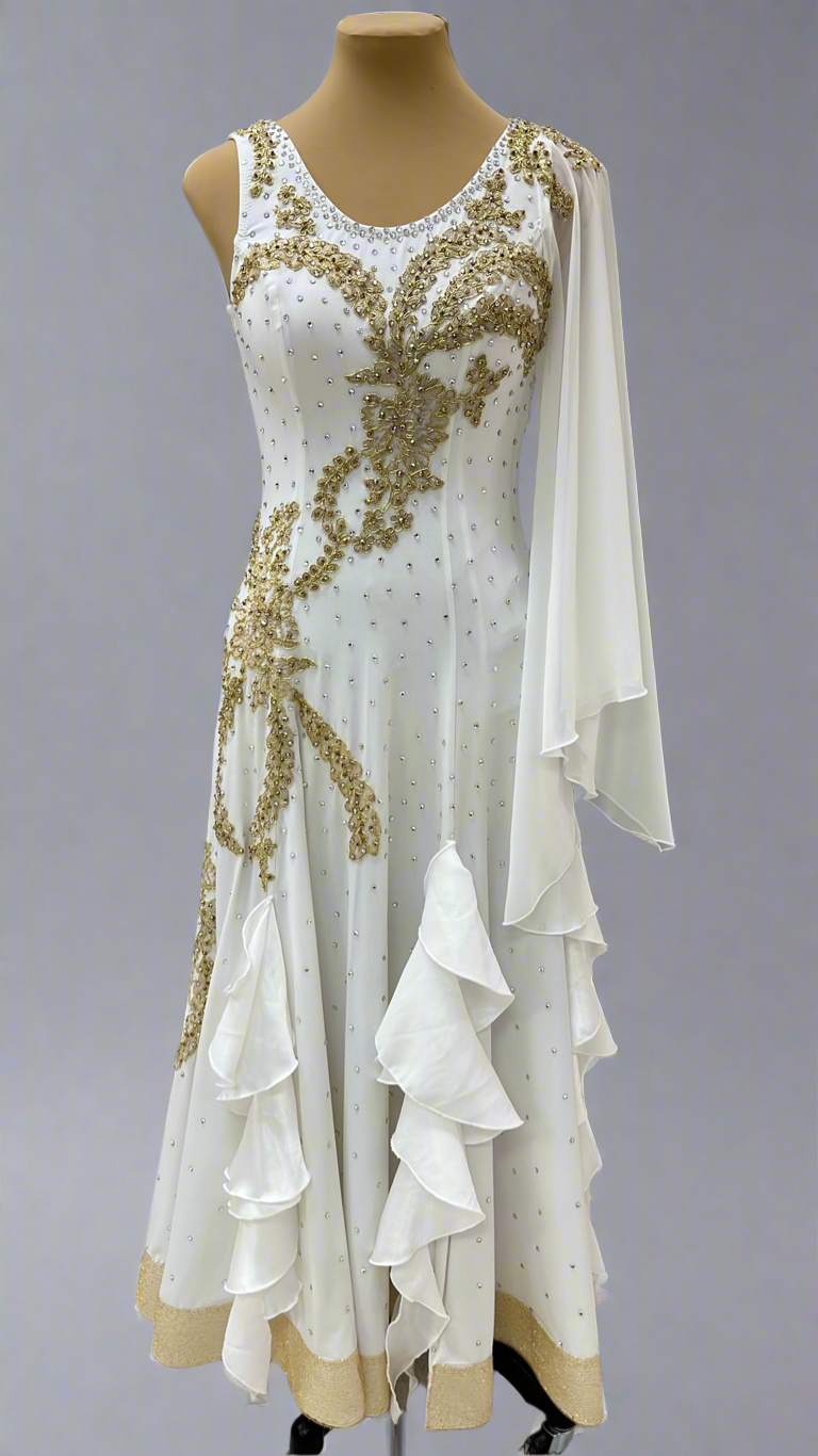 Harmonia is tailored for the refined elegance of American Smooth Waltz and Foxtrot. This exquisite gown features a soft ivory base with delicate gold embroidery cascading across the bodice and long lace sleeves, accented by subtle rhinestone embellishments. Crafted from lightweight, flowing fabric, it ensures graceful movement while the layered ruffles and golden hemline add a touch of opulent charm. The harmonious blend of intricate detailing and fluid design makes Harmonia ideal for dancers seeking to embody sophistication and poise on the dance floor. Glide with grace in Harmonia.