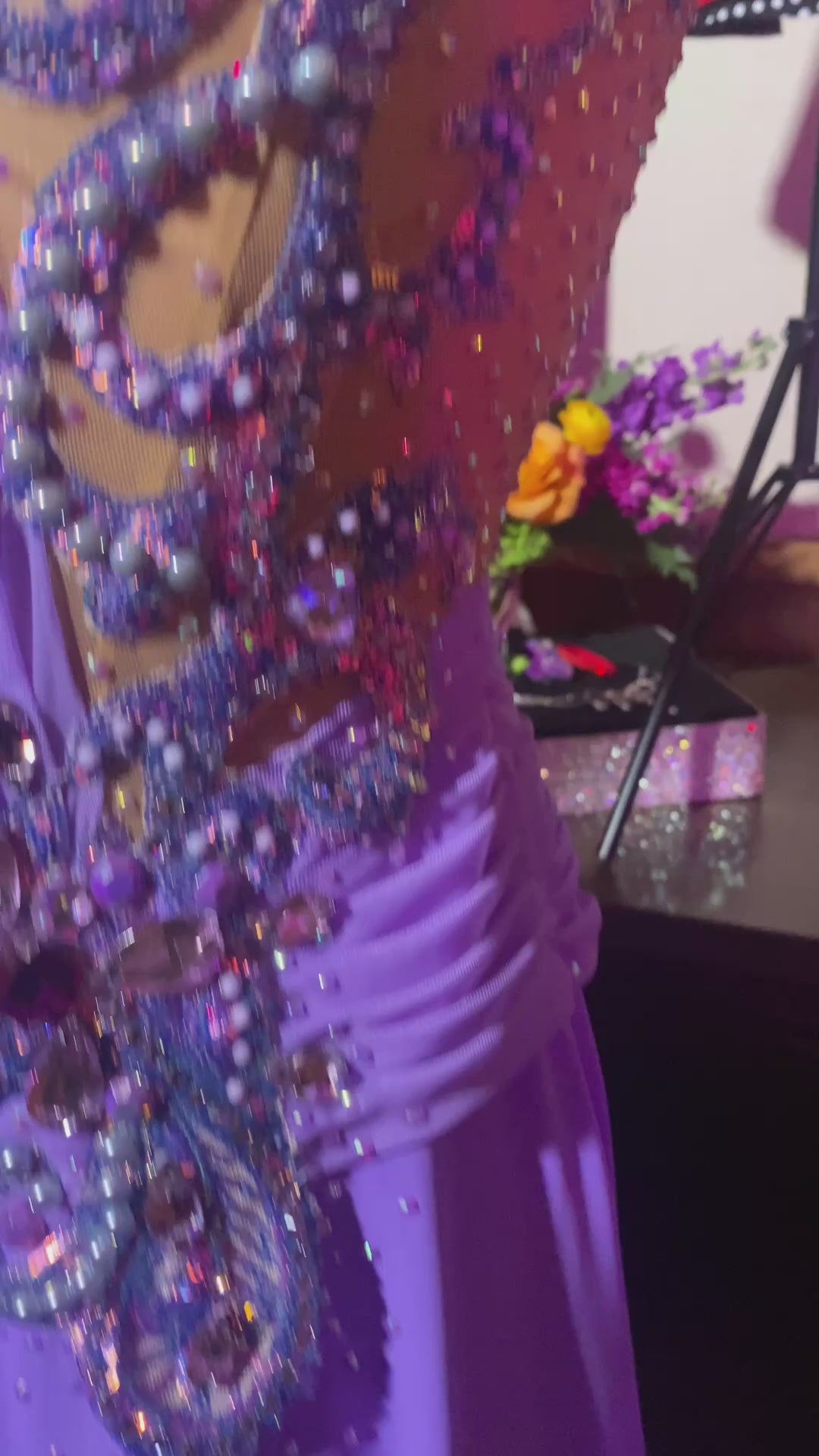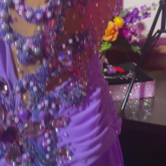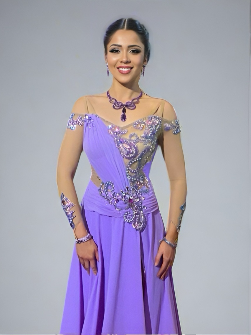 Lavender Lights is designed for the graceful sweeps of American Smooth Waltz and Foxtrot. This elegant gown features a luscious lavender lilac hue, crafted from soft Lyra and mesh layered over a nude tan base, creating a delicate and ethereal silhouette. The dress is exquisitely adorned with intricate rhinestone embellishments in violet and lavender tones, accented with sparkling crystals that highlight the off-shoulder neckline and flowing sleeves. Made from lightweight, premium fabric, it ensures effortless movement while the flowing skirt adds a touch of timeless romance. Perfect for dancers seeking to embody elegance and charm, Lavender Lights illuminates the dance floor with every step.