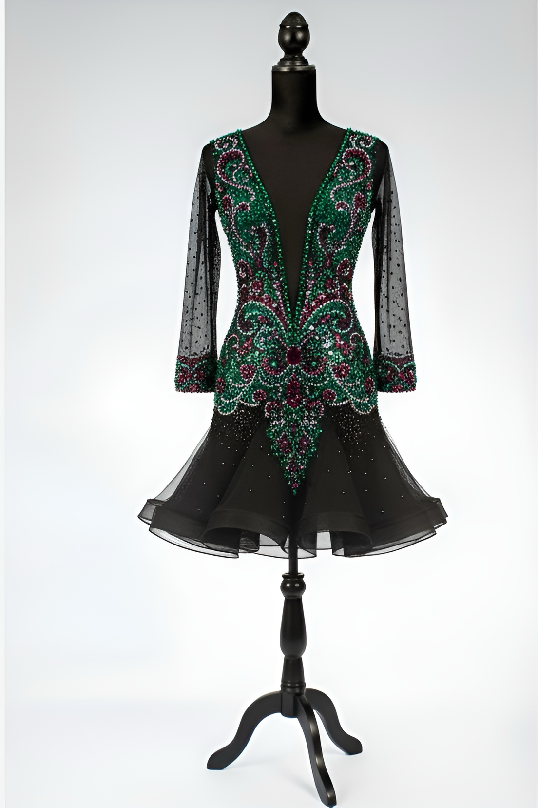 This rhythm ballroom dance gown from The Indian Palace Collection draws inspiration from intricate mehndi designs, featuring a sleek black base with vibrant emerald green and fuchsia beading in swirling, ornate patterns across the bodice. The deep V-neckline and sheer long sleeves with matching embellishments add dramatic flair, while the layered black tulle skirt provides sparkle and dynamic movement for mambo spins. A portion of proceeds supports orphanages in India. You Dream, WE Design—where heritage dances with rhythm.