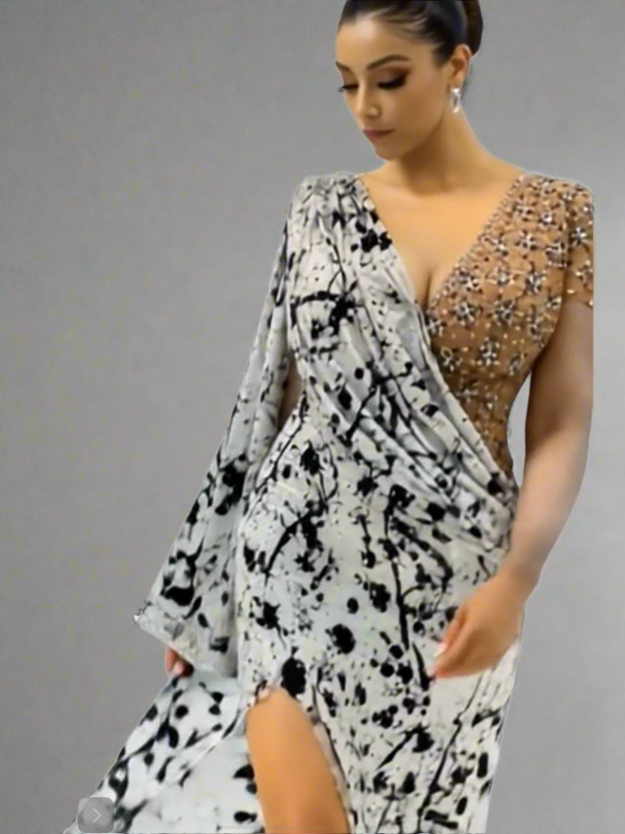 Let your moves shine with our Moxie gown! This Latin ballroom dress is the perfect blend of style with its white backdrop, artistic black splatter and sparkles, and elegant drape to one side. The nude mesh bodice is heavily embellished with rhinestones for that extra sparkle. And, of course, it has a long, sleek skirt that's made for Latin motion! Moxie: the perfect combination of drama and finesse.