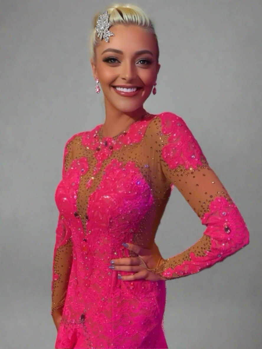 This succulent dress features a decadent taffy-hued lace paired with a cozy nude mesh. The intricate neckline and bodice are embellished with dazzling pink rhinestones, giving off an air of sophistication and refinement. With a lace overlay on a flowy satin chiffon skirt, this dress is a delicious treat in every way.