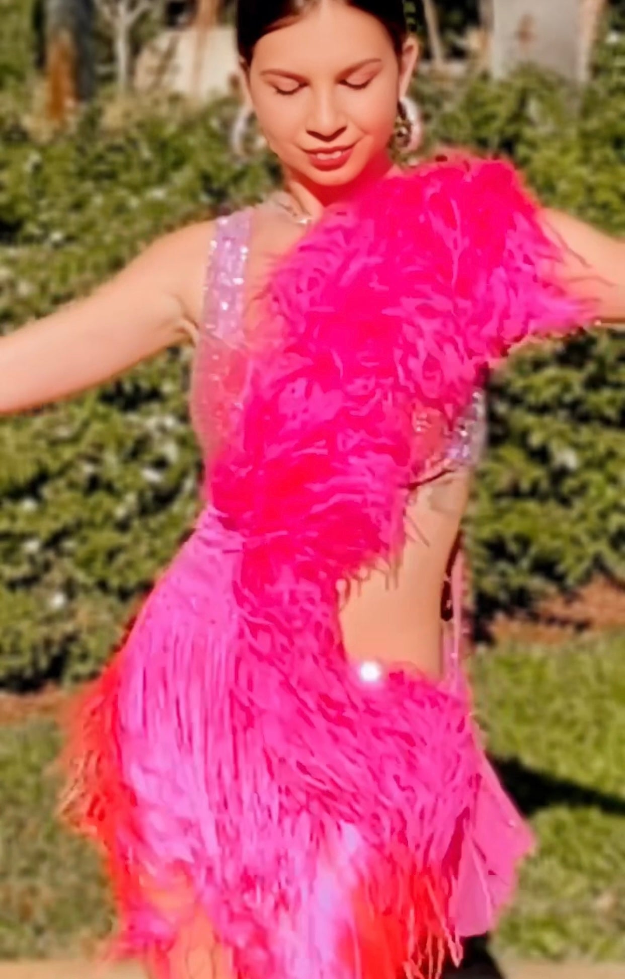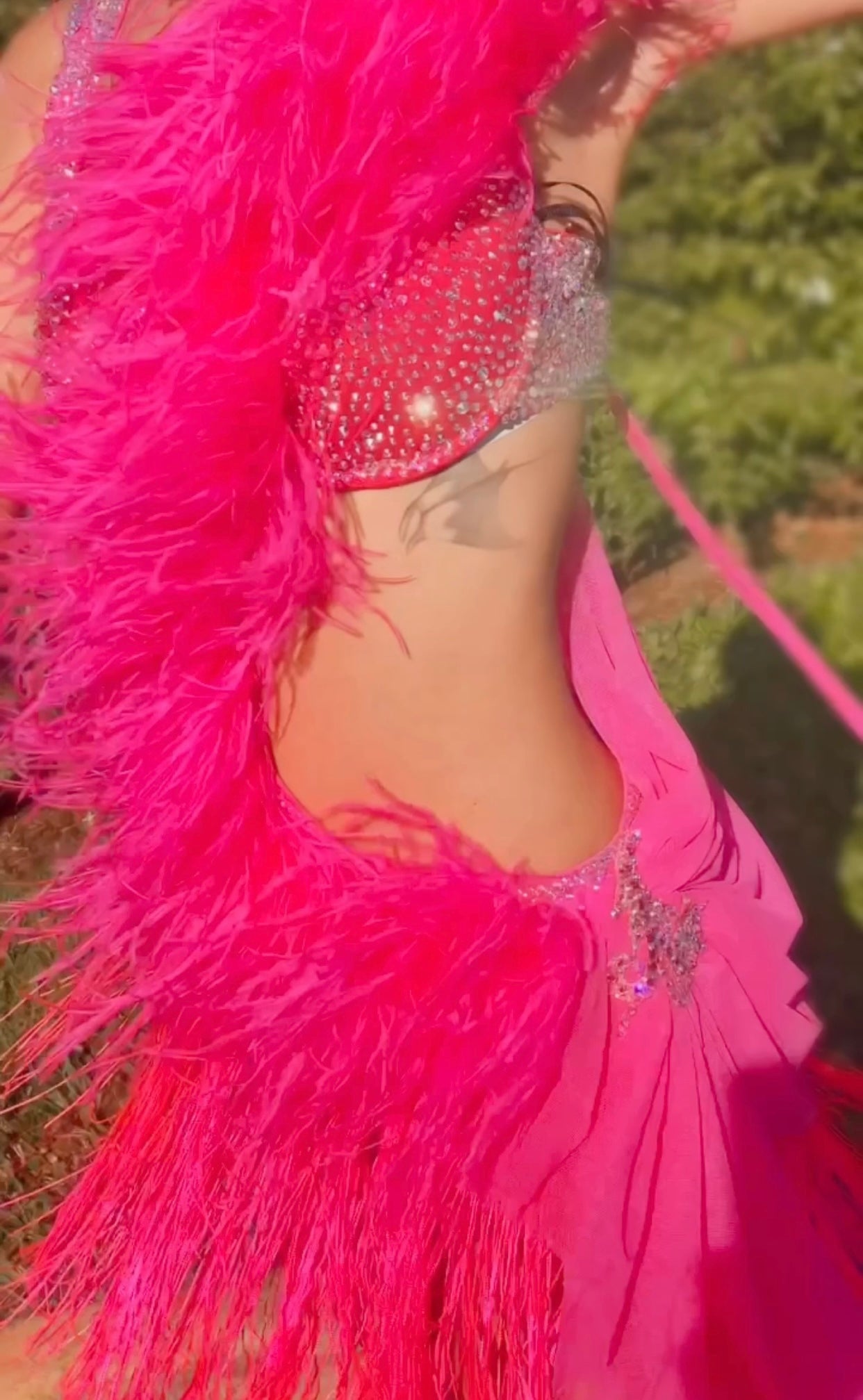Look fabulous in this Pixie in Pink rhythm ballroom dress! Show off in this flirty frock with individually placed hot pink fringe and sparkling Aurora borealis rhinestones. Perfect for twirling up a storm on the dance floor - get ready to rock that salsa in style!