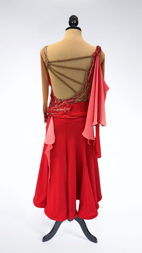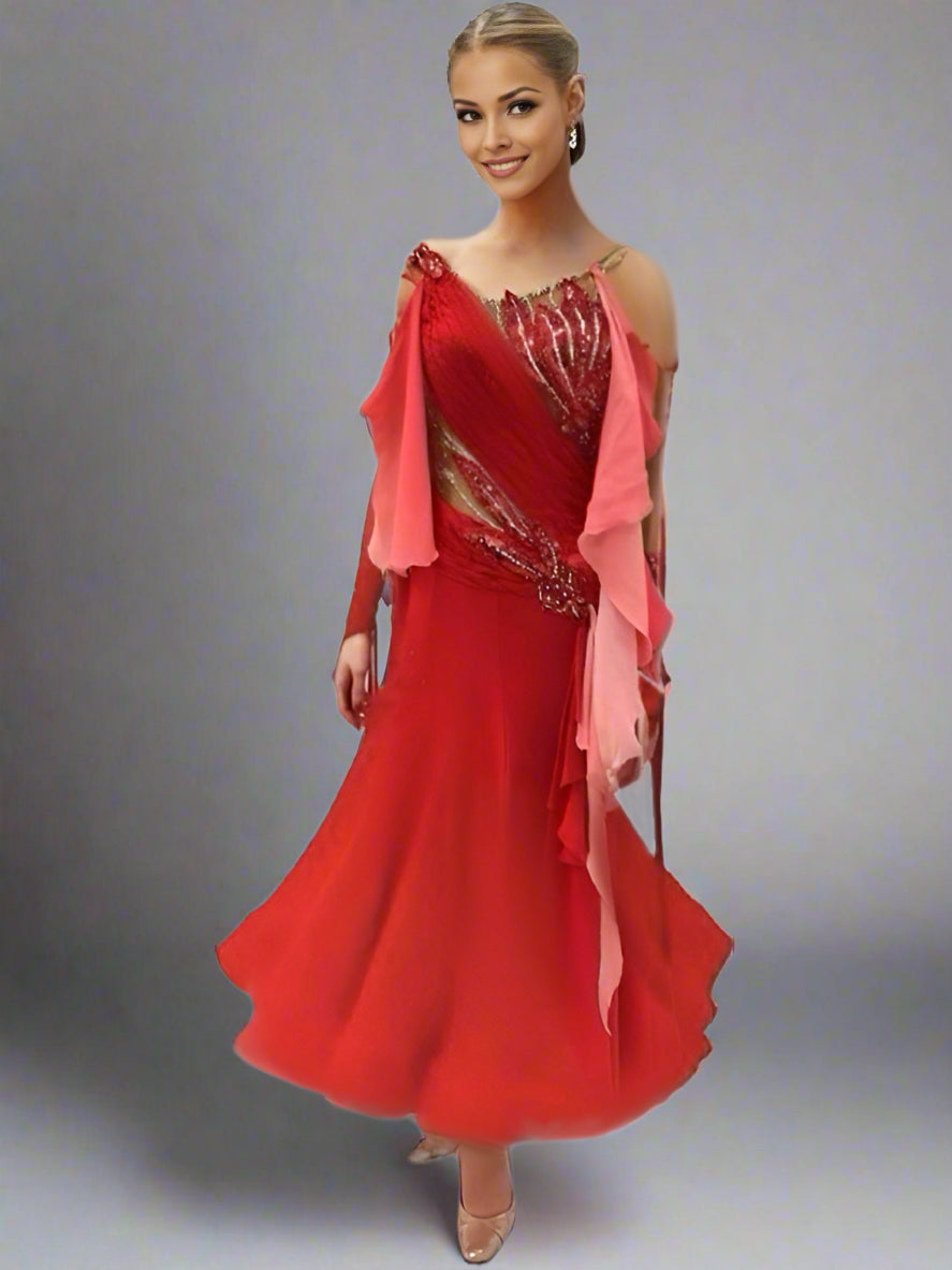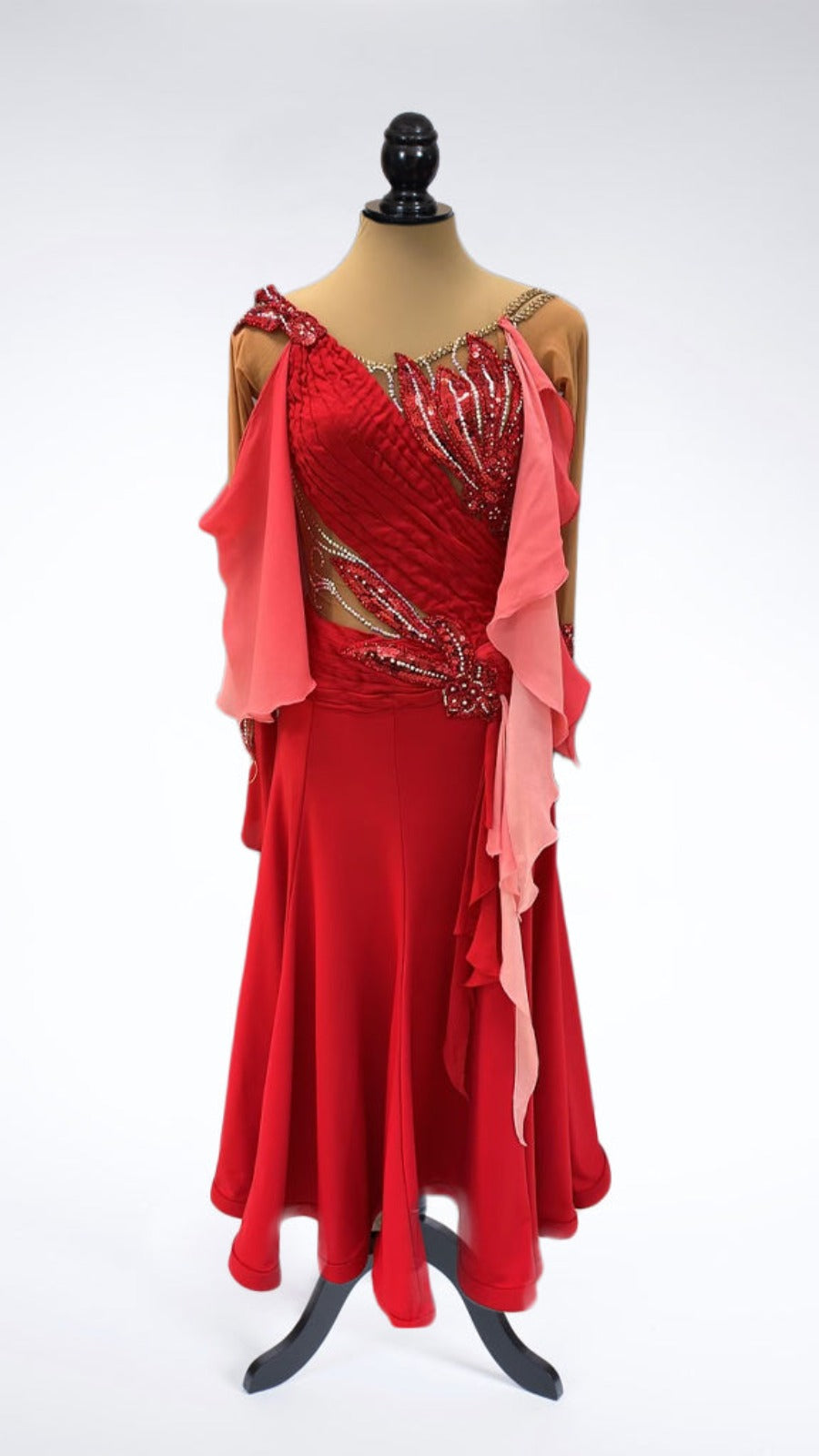 Indulge in sophistication with Robin Hood's American smooth ballroom dance gown. The nude bodice is elevated by a delicate, flowing red georgette that cascades down the gown, embellished with vibrant red appliques and sparkling crystal AB and light siam rhinestones.