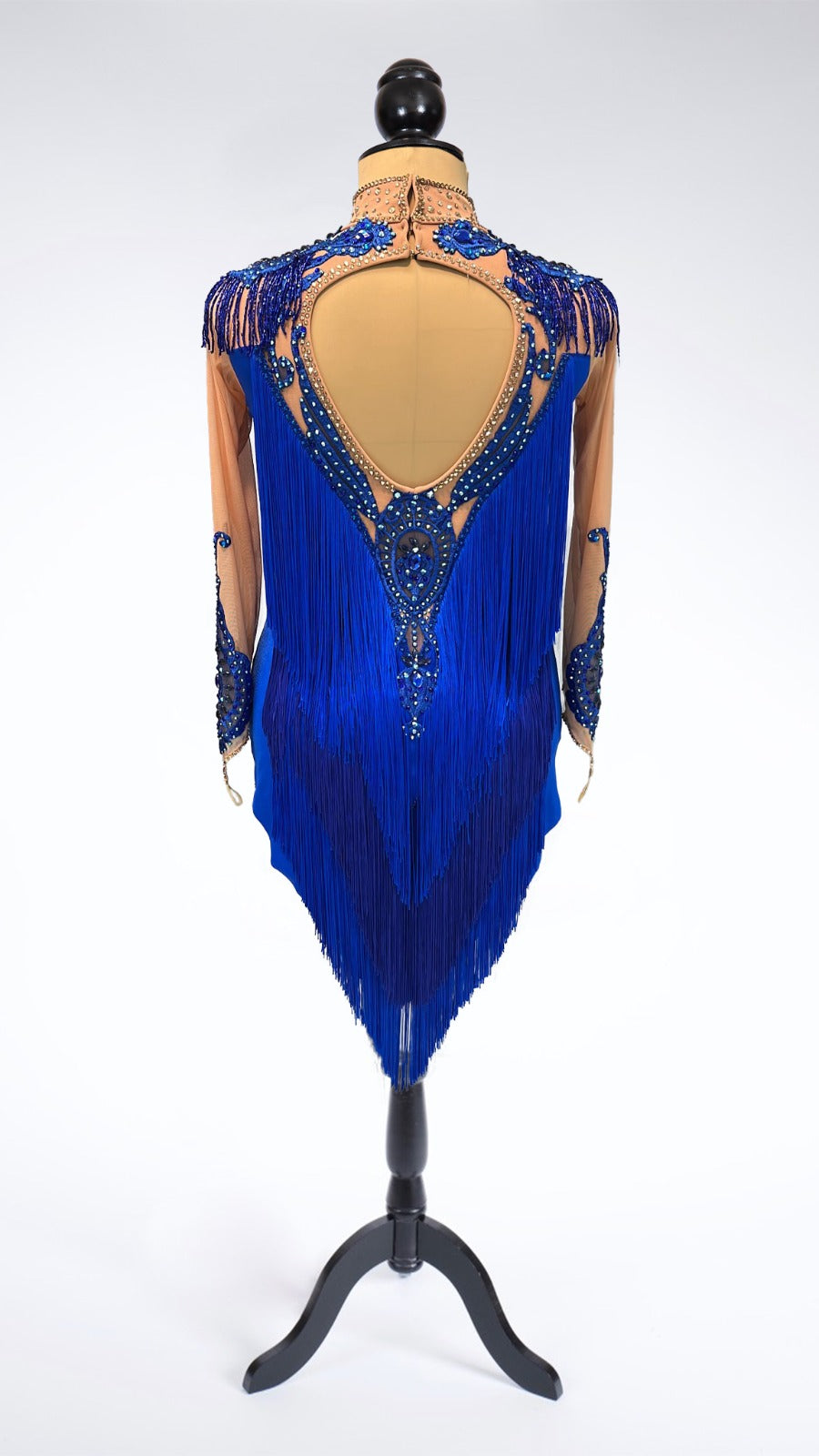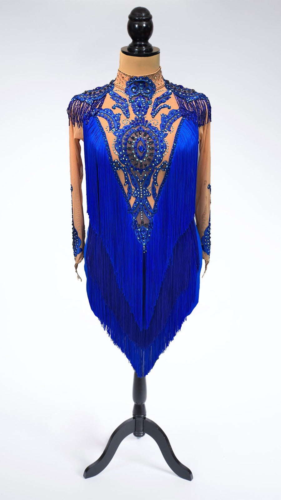 Rock N' Roll is not just any ordinary dress - it's a competitive ballroom dance gown that will elevate your performance to the next level! With its stunning electric blue color and luxurious fringe rhythm, this gown is designed to make you stand out on the dance floor. The elegant electronic blue Brocade appliqués are strategically placed and hand-sewn to a nude mesh plunging neckline, creating a look that is both sophisticated and daring. So if you're a competitive ballroom dancer looking for a gown that will help you shine, look no further than Rock N' Roll. Order yours today and get ready to take your performance to new heights!