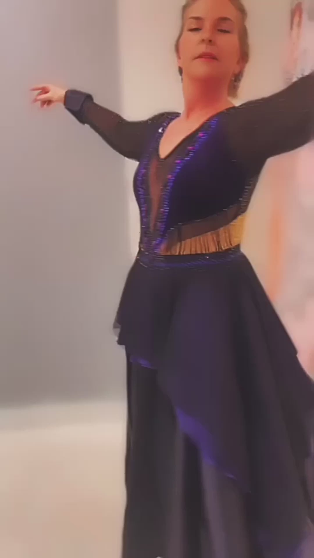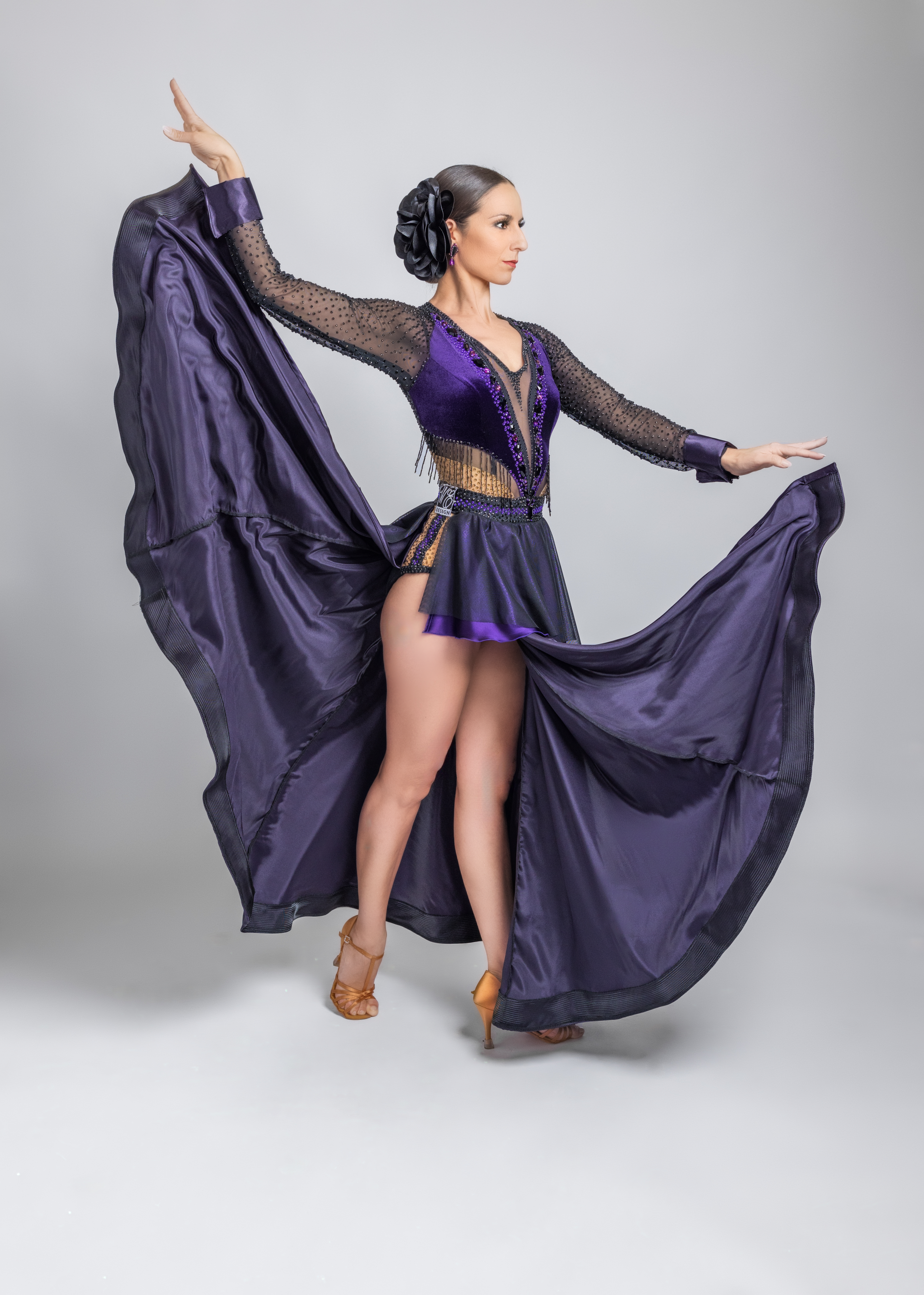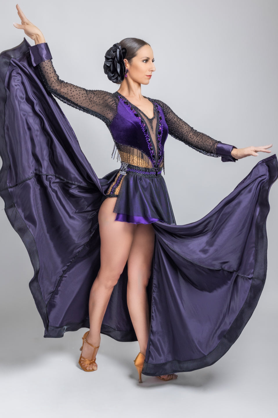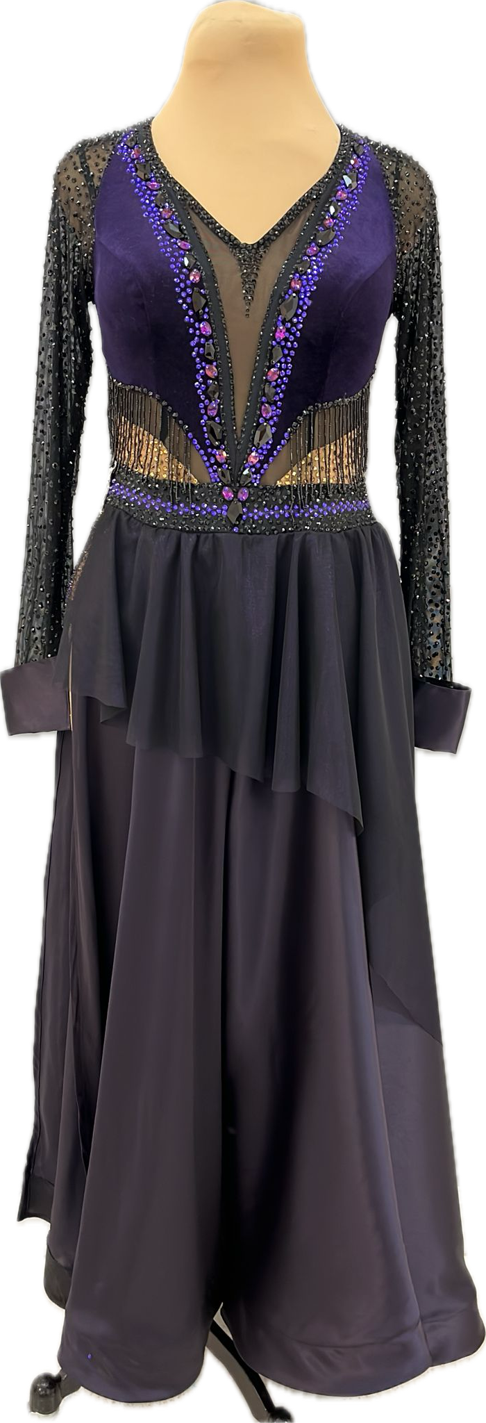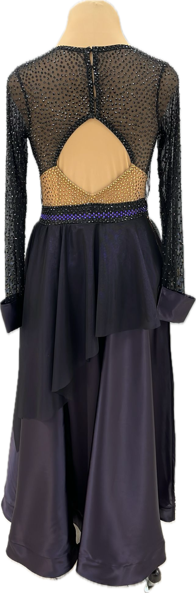 Transform the dance floor with the stunning Bold Dark American Smooth / Tango "Royal Platinum." The plunging V neck design not only elevates your lines, but also exudes a seductive sophistication to your ballroom look. The stoned trim delicately defines and sculpts the waistline, creating a mesmerizing silhouette. The bold full skirt flows gracefully with your every movement, and the high slit frames and elongates your leg line. Don't hesitate to seize this exquisite gown as it is currently available.