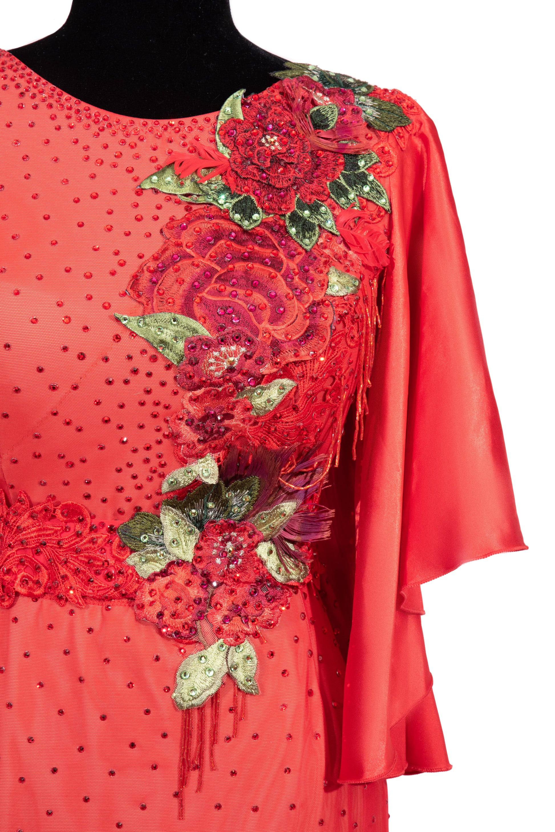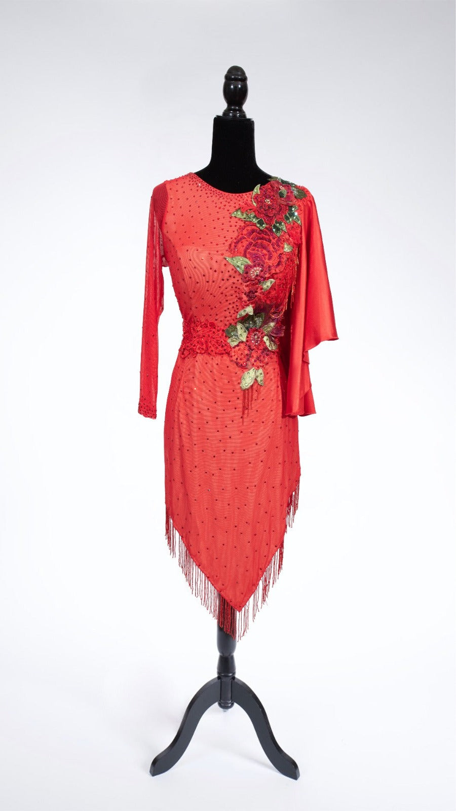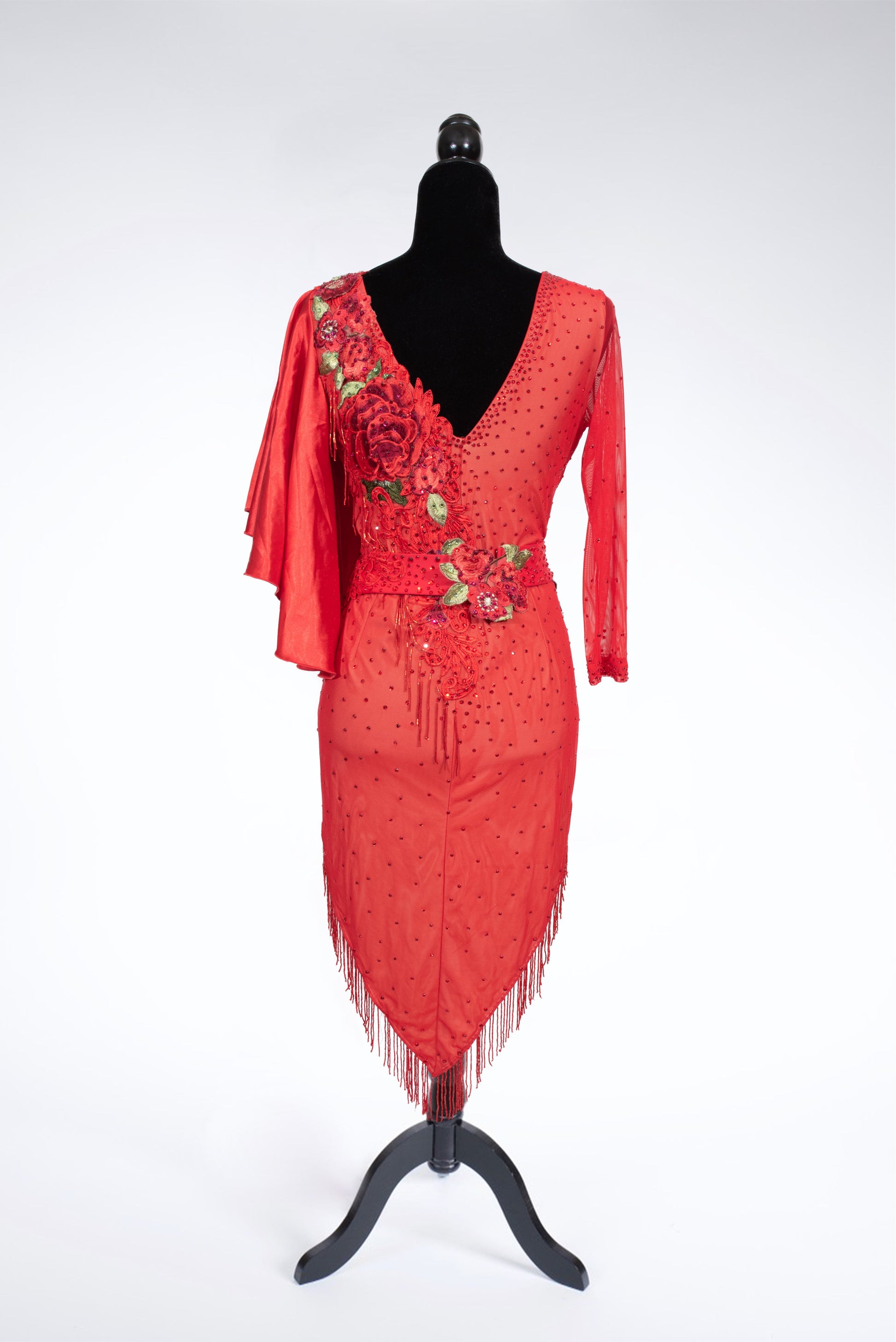 This breathtaking Latin ballroom dance gown is the perfect fusion of sophistication and edge. Featuring a luxe rhinestoned red mesh bodice and an asymmetrical beaded fringe skirt, this gown is further adorned by delicate embroidered roses on the neckline down into the belt. An exquisite choice for the confident dancer.