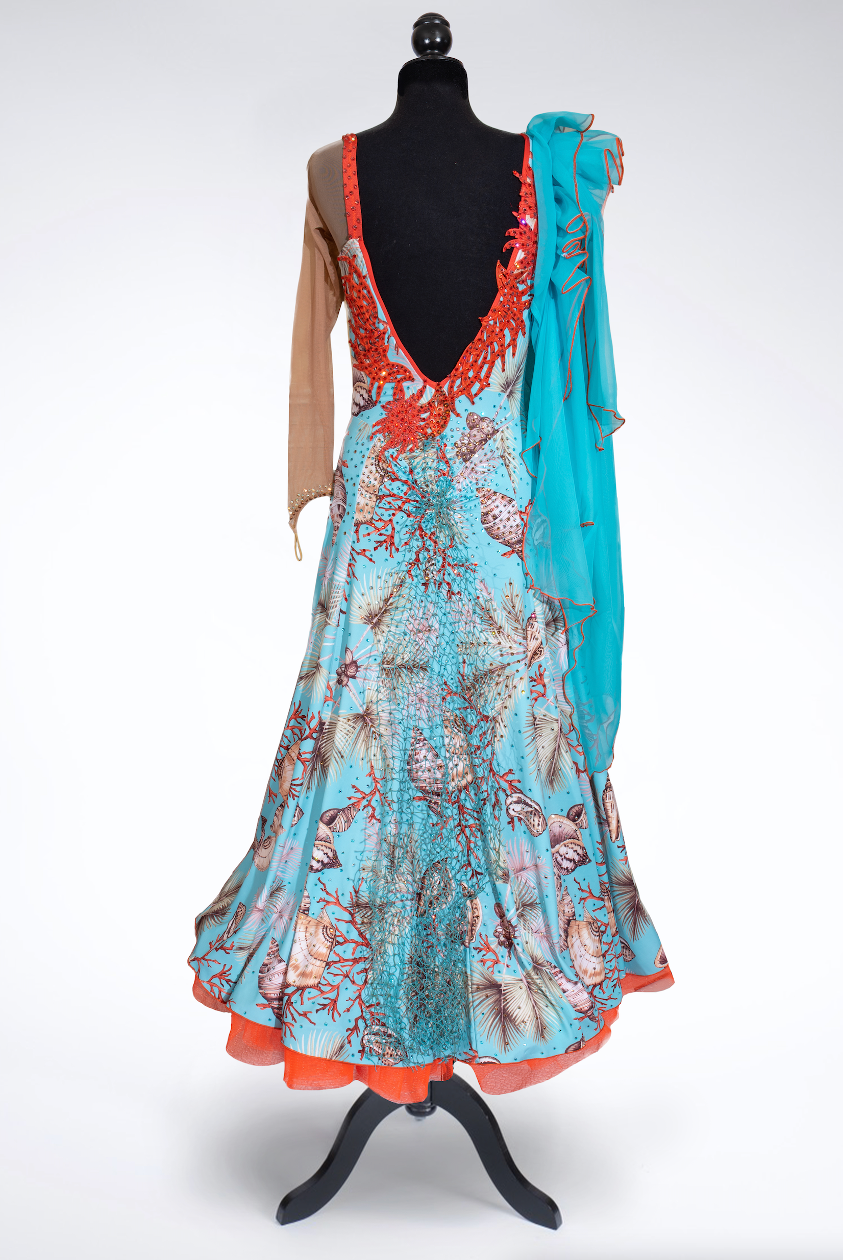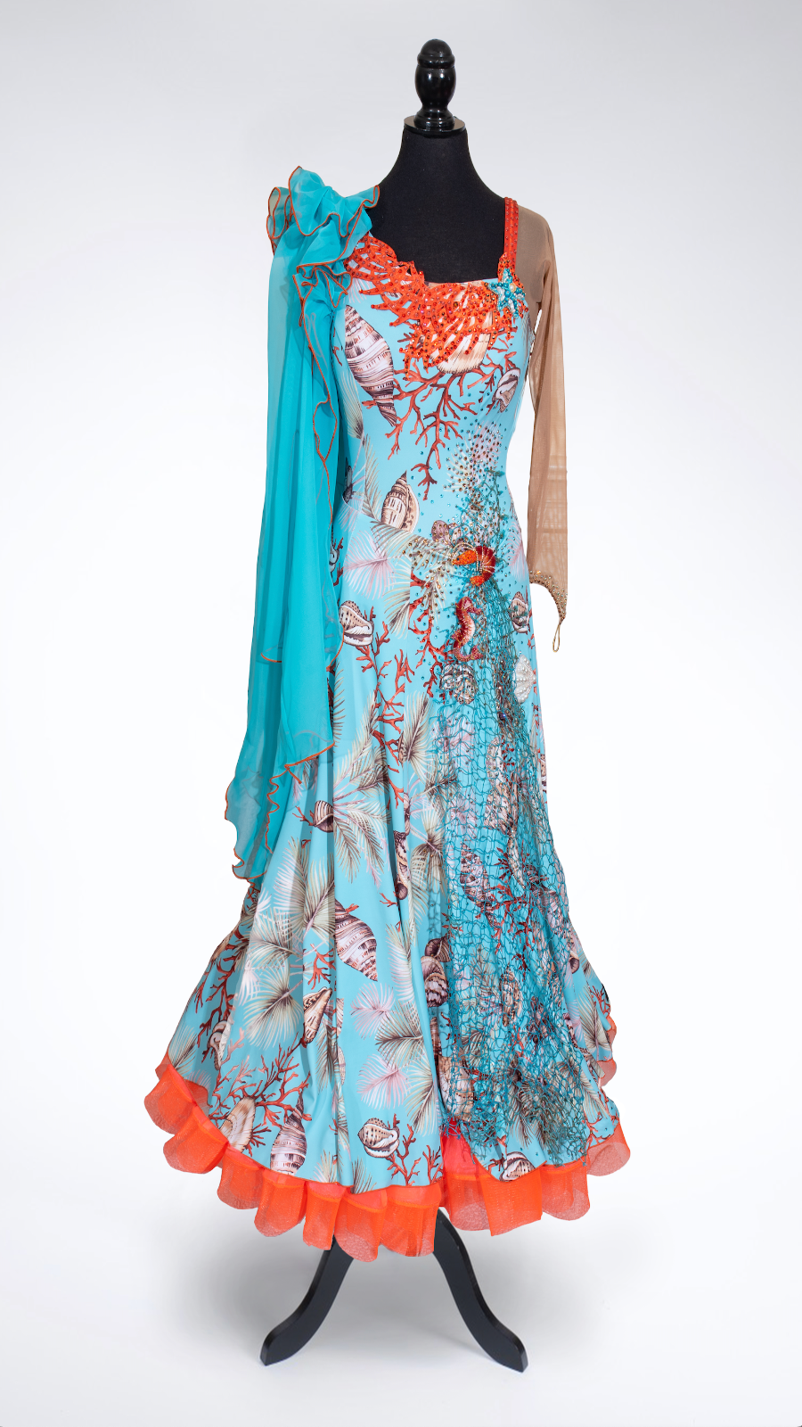 The beautiful St. Croix ballroom dress features a unique aqua under the sea print Lycra adorned with an aqua chiffon and coral Cauliflowered hem. The intricate details and vibrant colors blend a mixture of corals, tans, and blues, all enhanced with luxurious nautical-tone rhinestoned coral appliqués and of jeweled shells, seahorses, and starfish. Perfect for both American smooth and international standard dances.