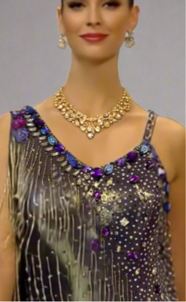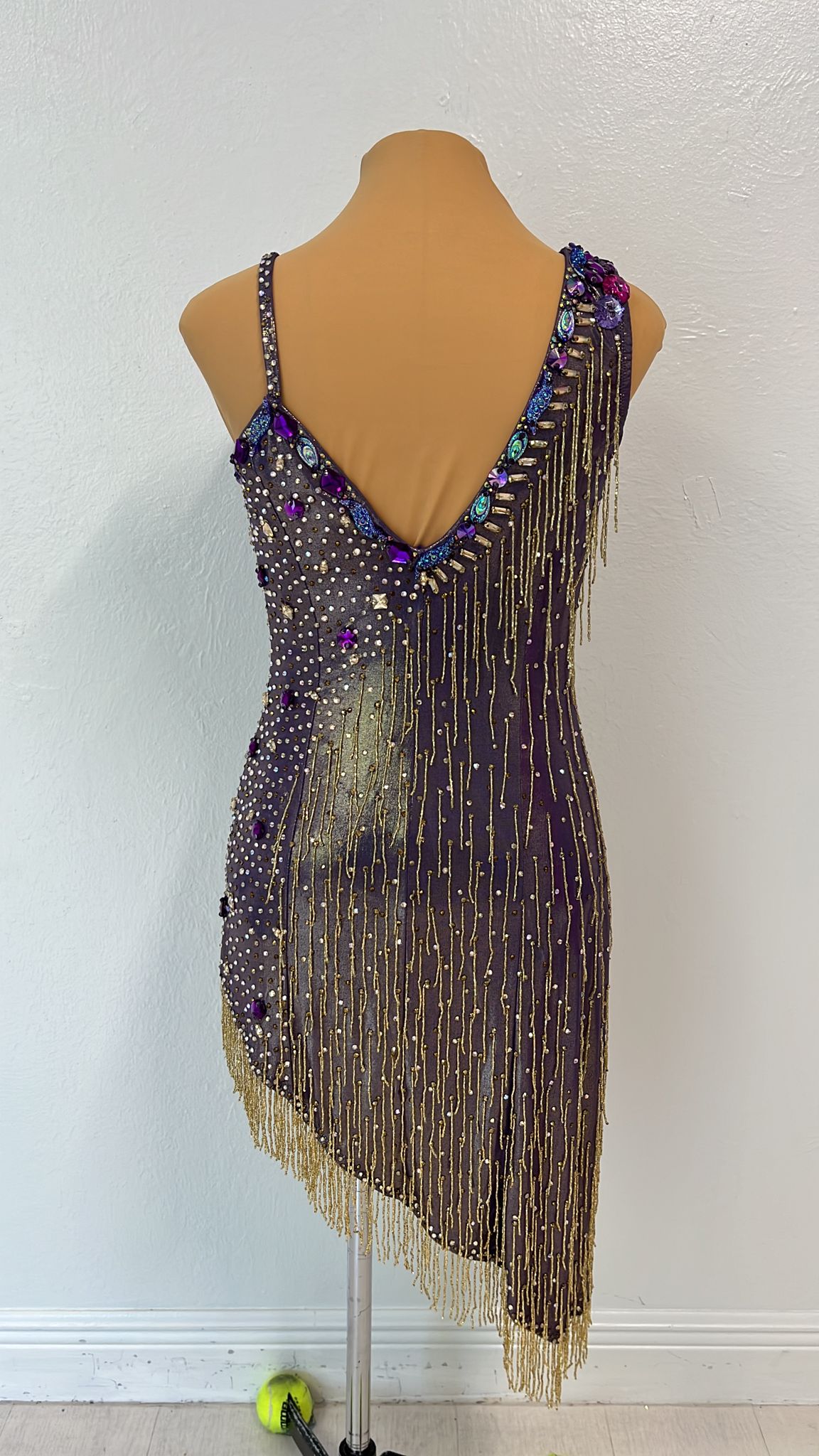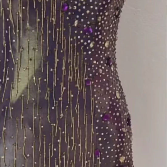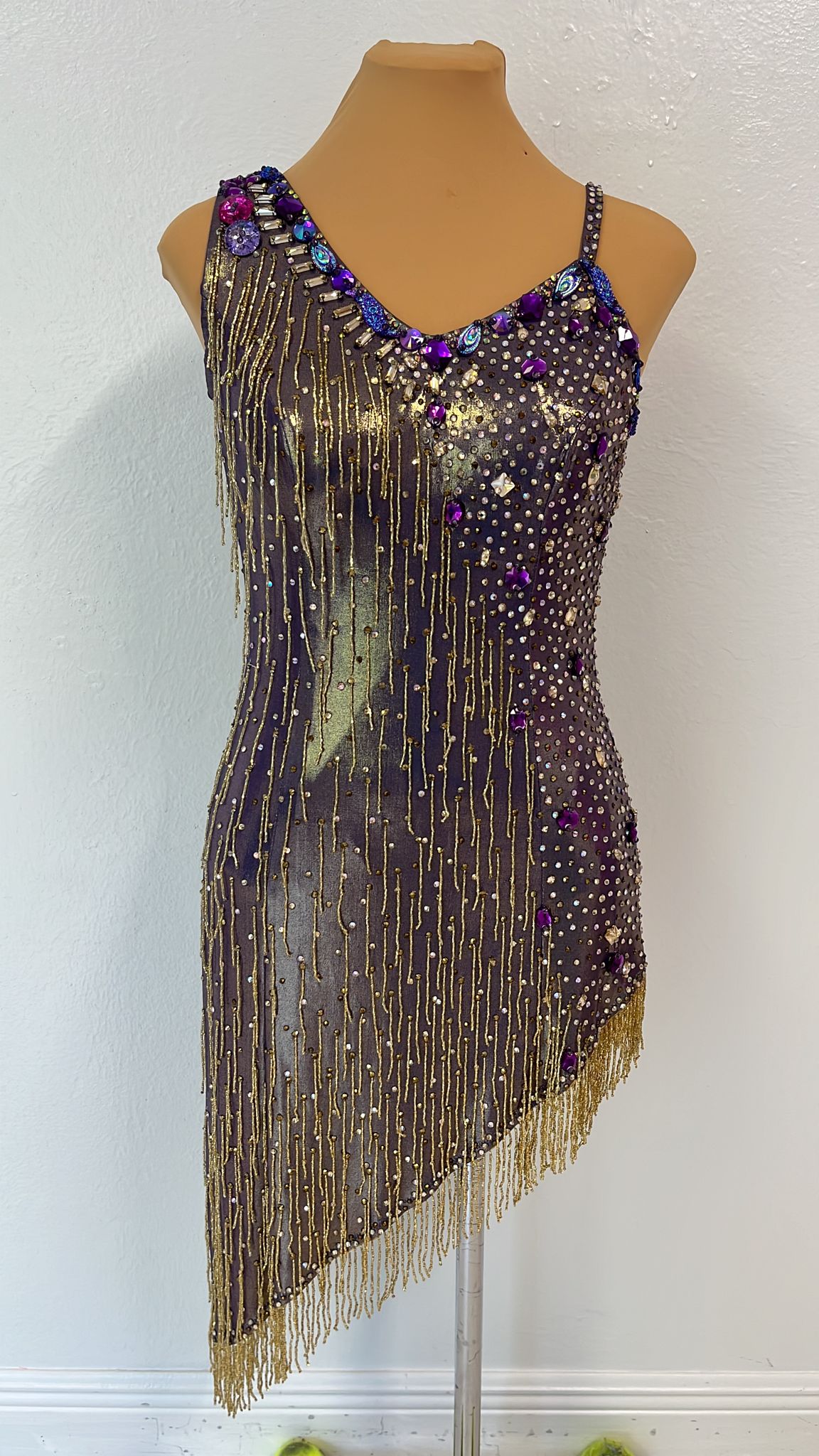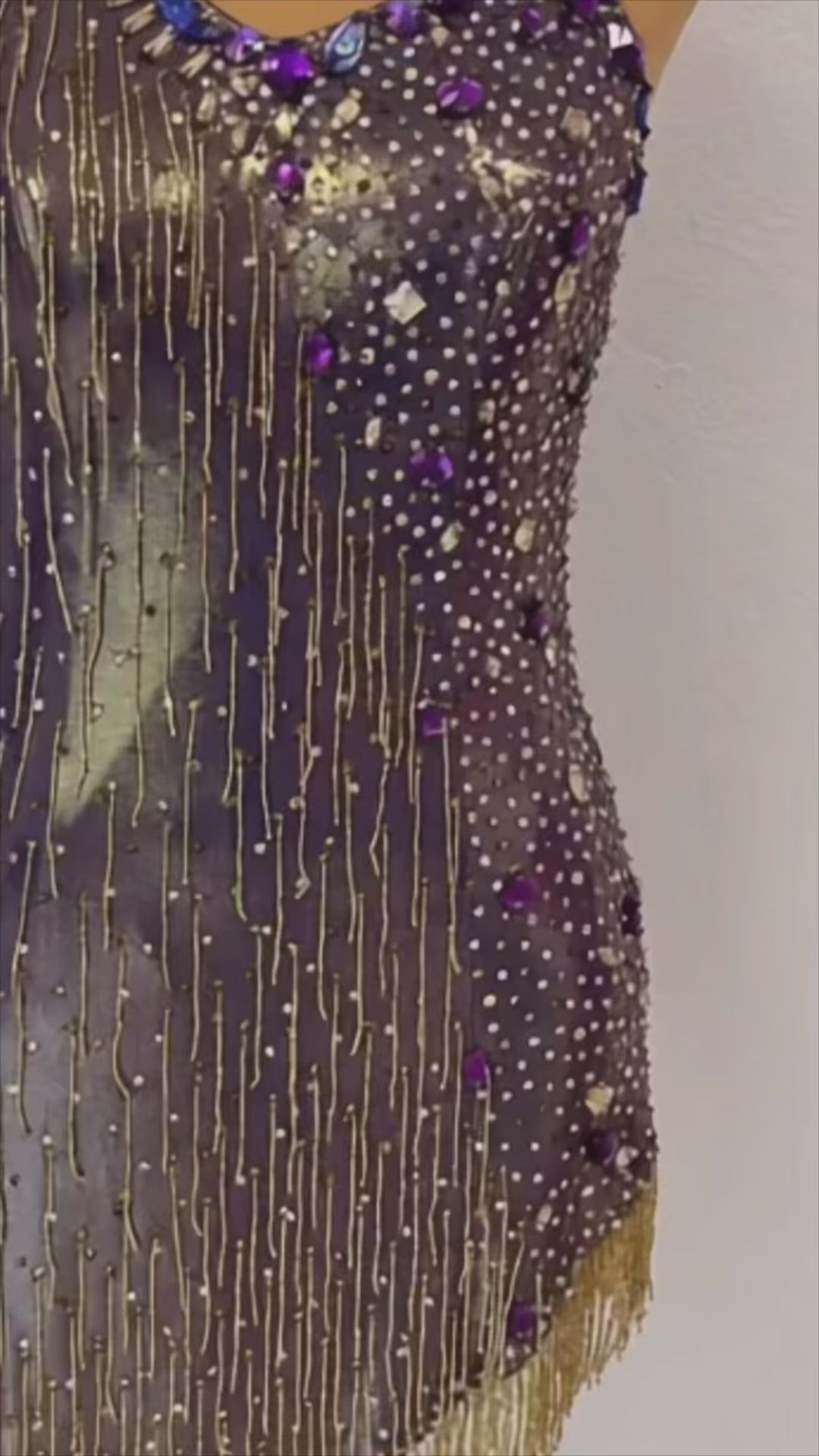 Starlight Sparkle is crafted for the sultry beats of Samba and Rumba. This dazzling Latin rhythm gown features a deep, iridescent base adorned with cascading gold and multicolored fringes, accented by intricate beadwork and sequins that shimmer across the bodice and asymmetrical hem. Made from lightweight, luxurious fabric, it allows for dynamic movement while the fitted design and flowing layers create a captivating, starlit effect. The bold embellishments and vibrant hues blend glamour with passion, making Starlight Sparkle perfect for dancers aiming to illuminate the dance floor with every step. Shine brilliantly in Starlight Sparkle.