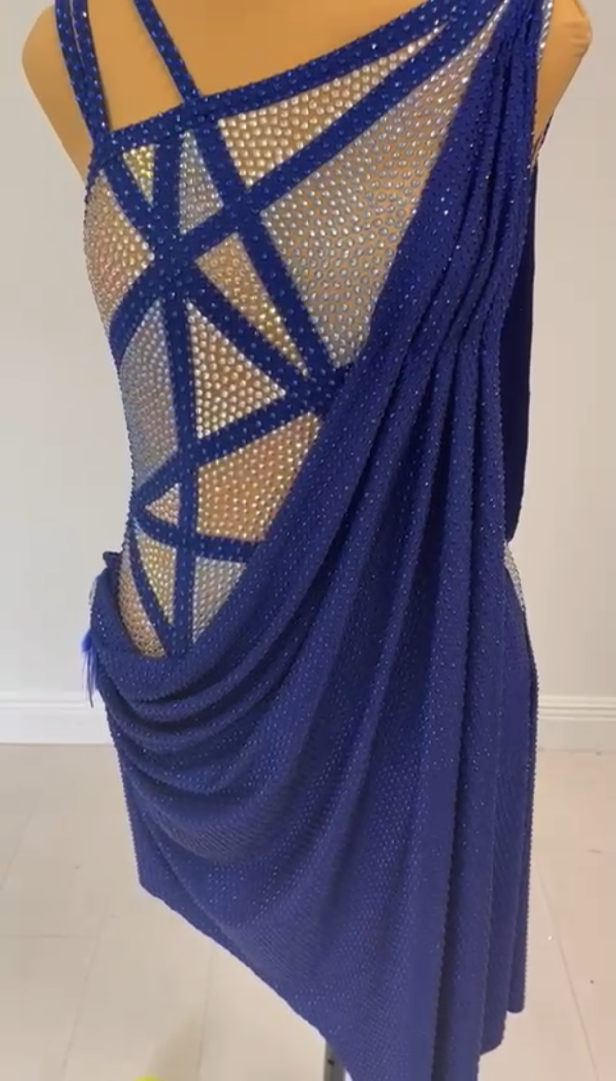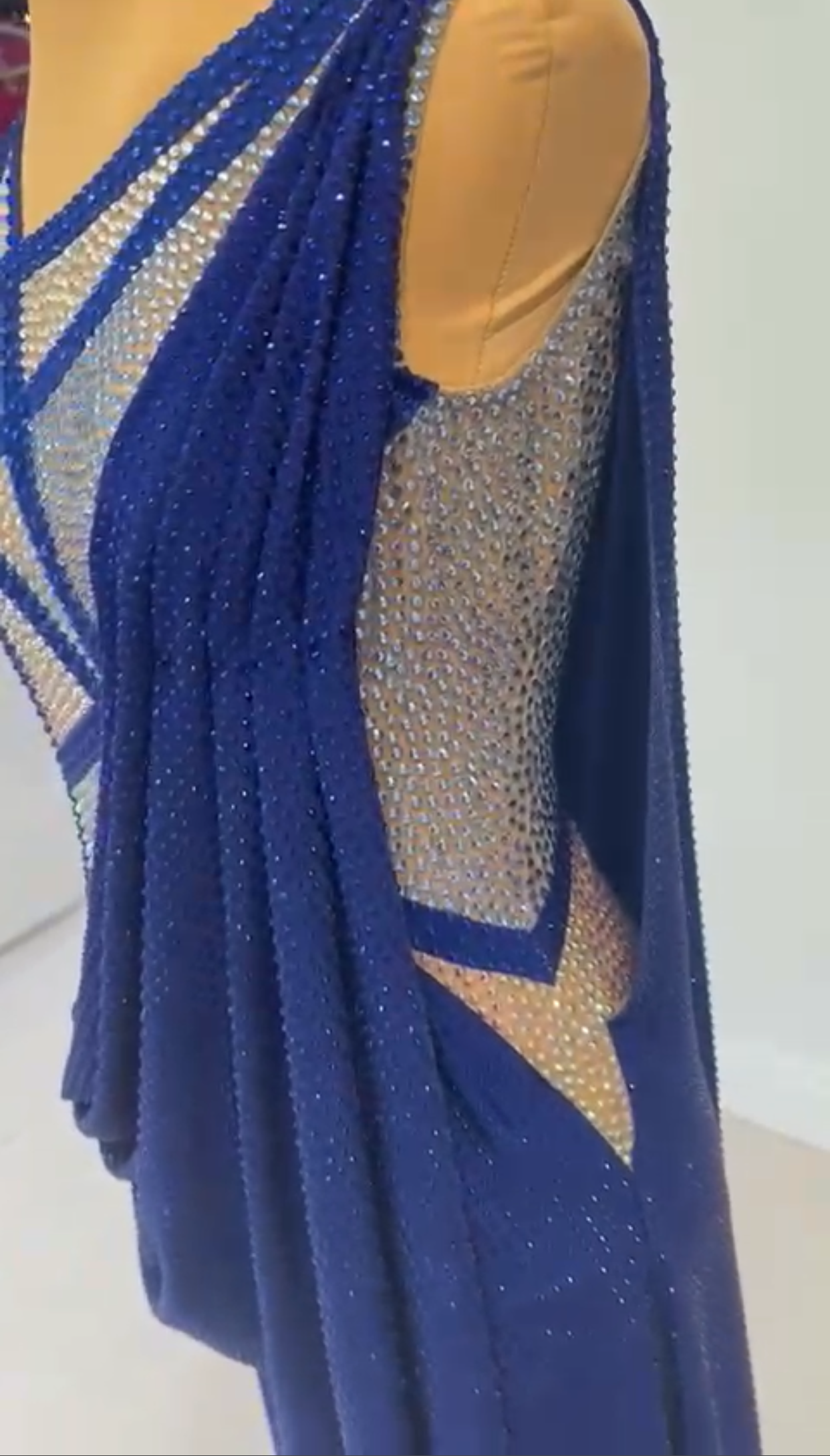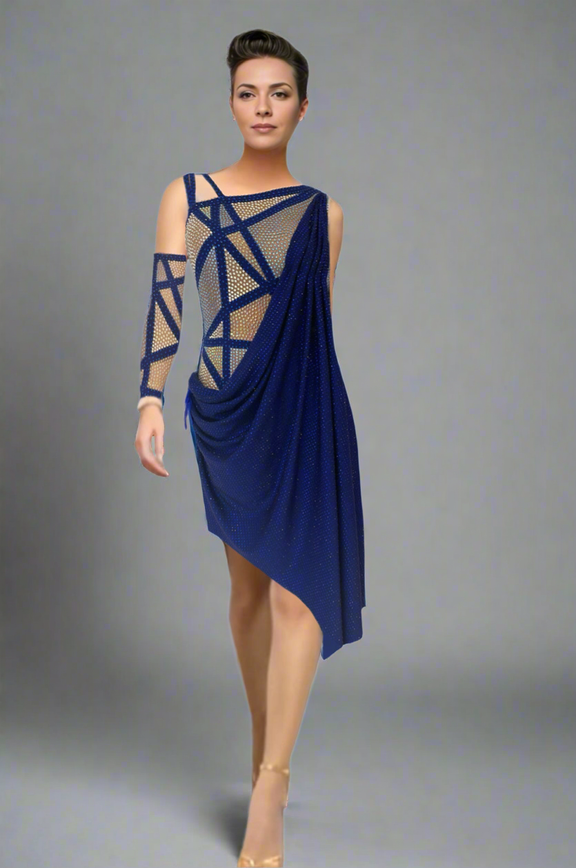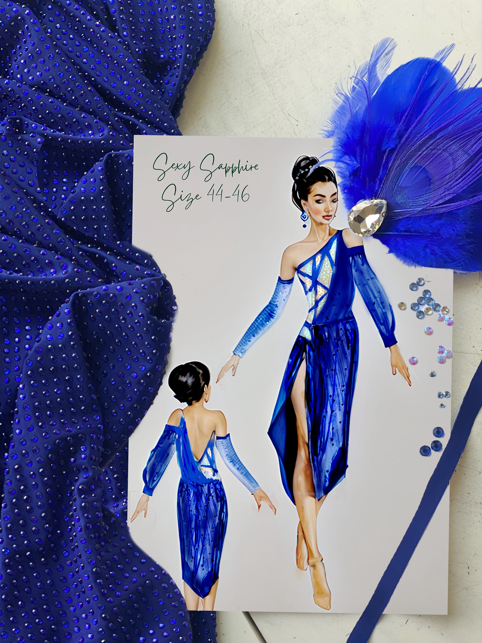 Sultan Sapphire is a luxurious piece made with a lavish sapphire draping fabric adorned with sapphire stones. The top showcases distinct angled details with stunning sapphire tone-on-tone rhinestones that catch the light brilliantly. The deep sapphire shades of the fabric flow gracefully, adding to the dress's sophistication and fluidity.
