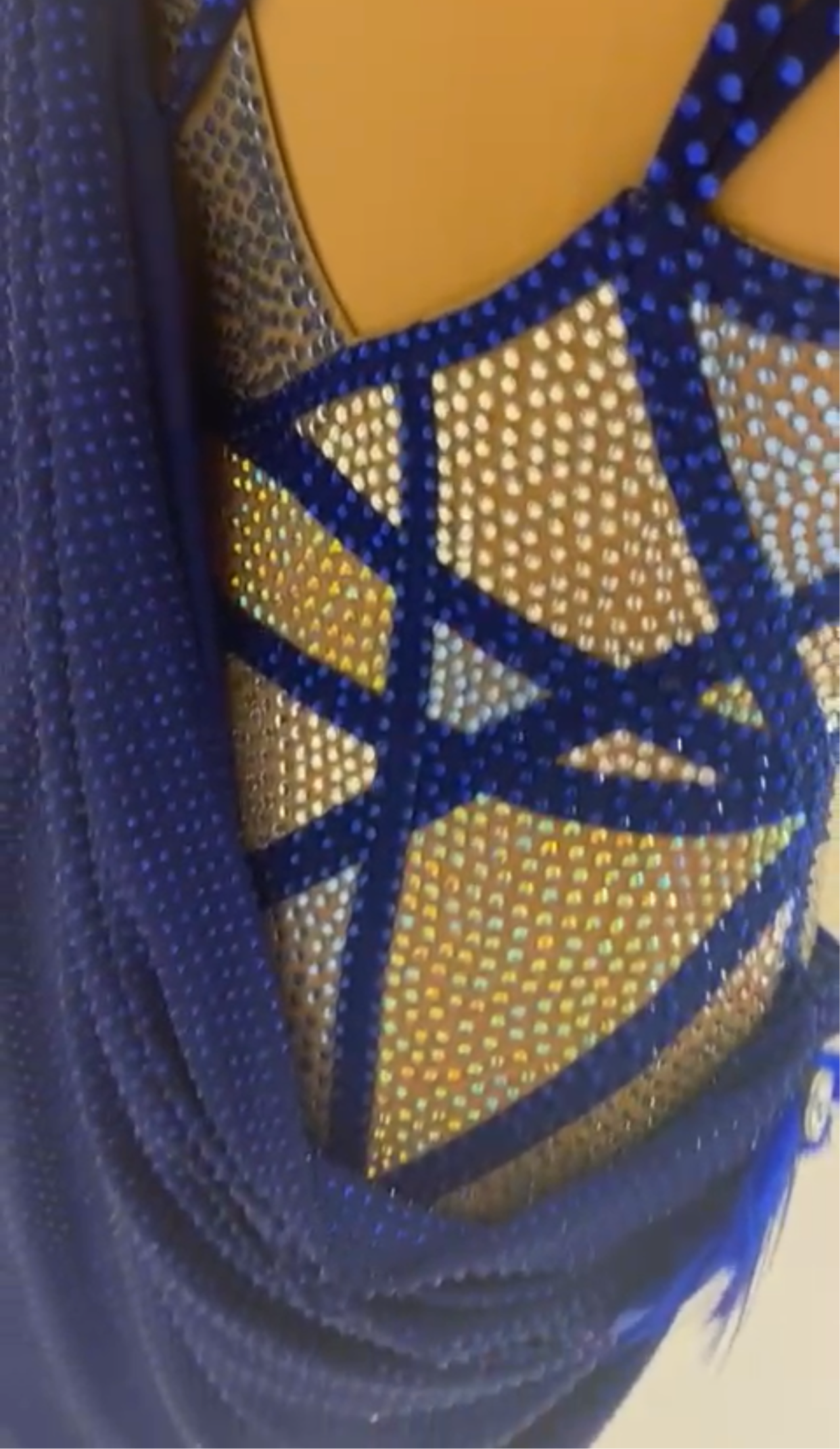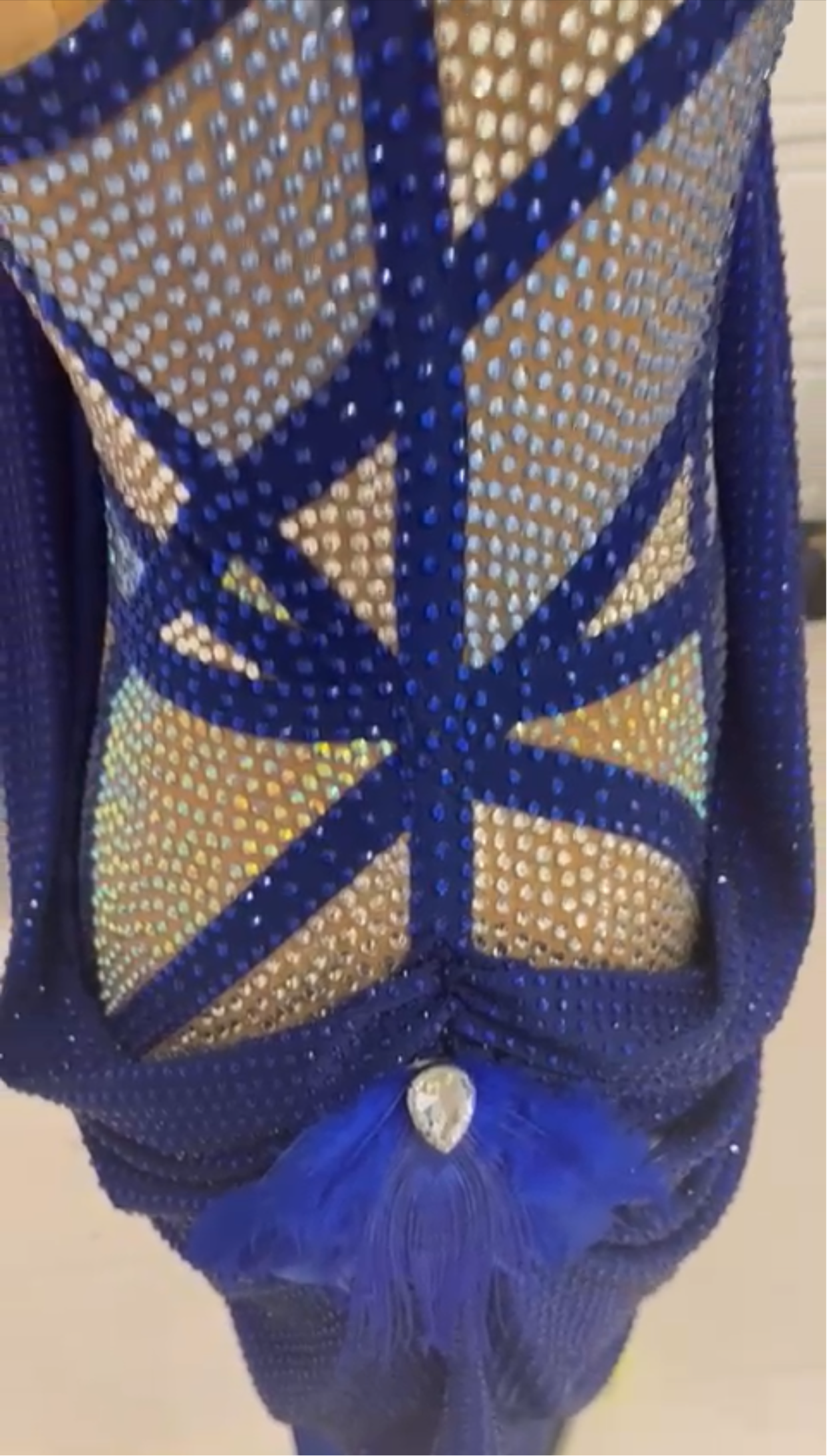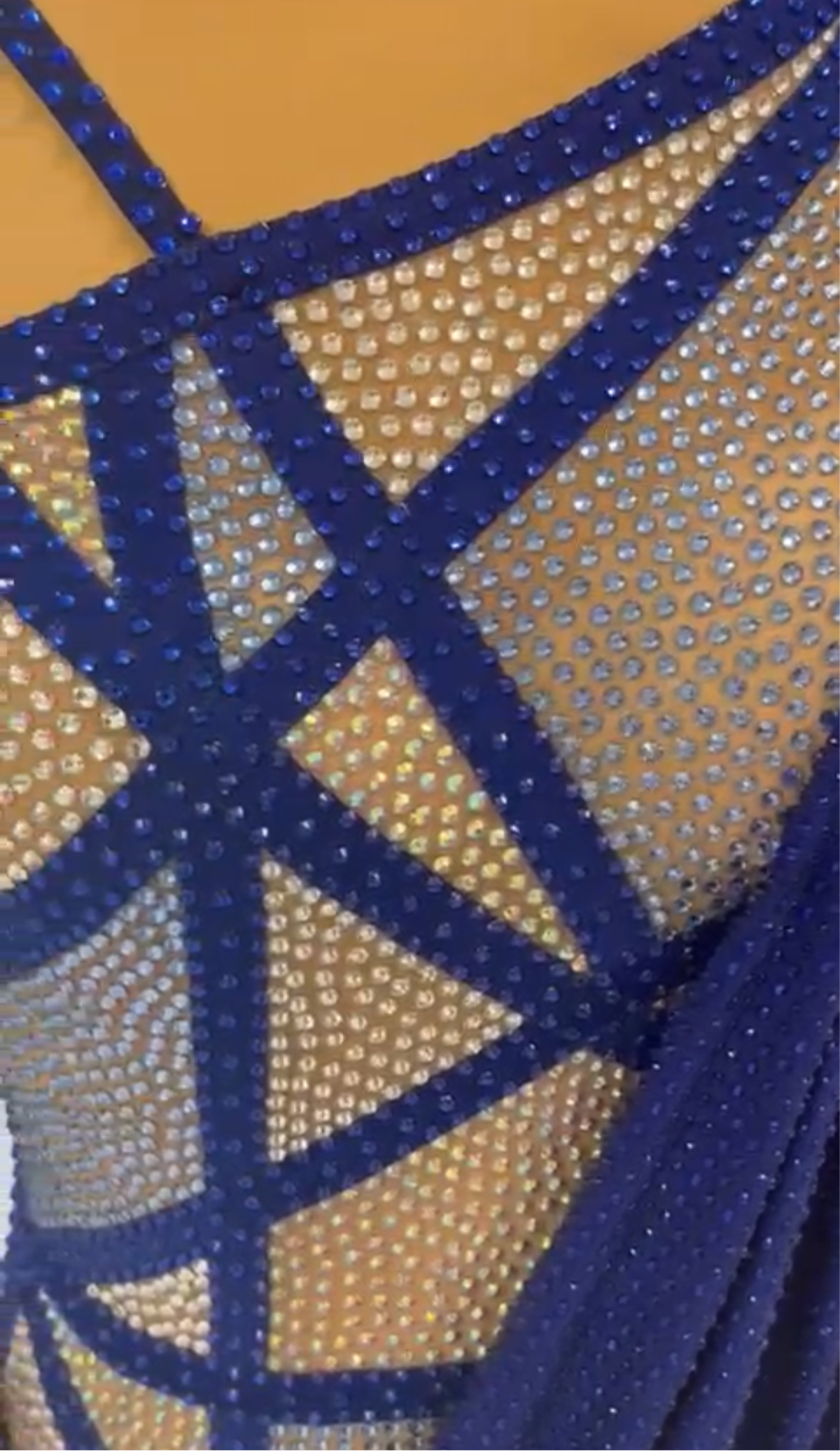 Sultan Sapphire is a luxurious piece made with a lavish sapphire draping fabric adorned with sapphire stones. The top showcases distinct angled details with stunning sapphire tone-on-tone rhinestones that catch the light brilliantly. The deep sapphire shades of the fabric flow gracefully, adding to the dress's sophistication and fluidity.