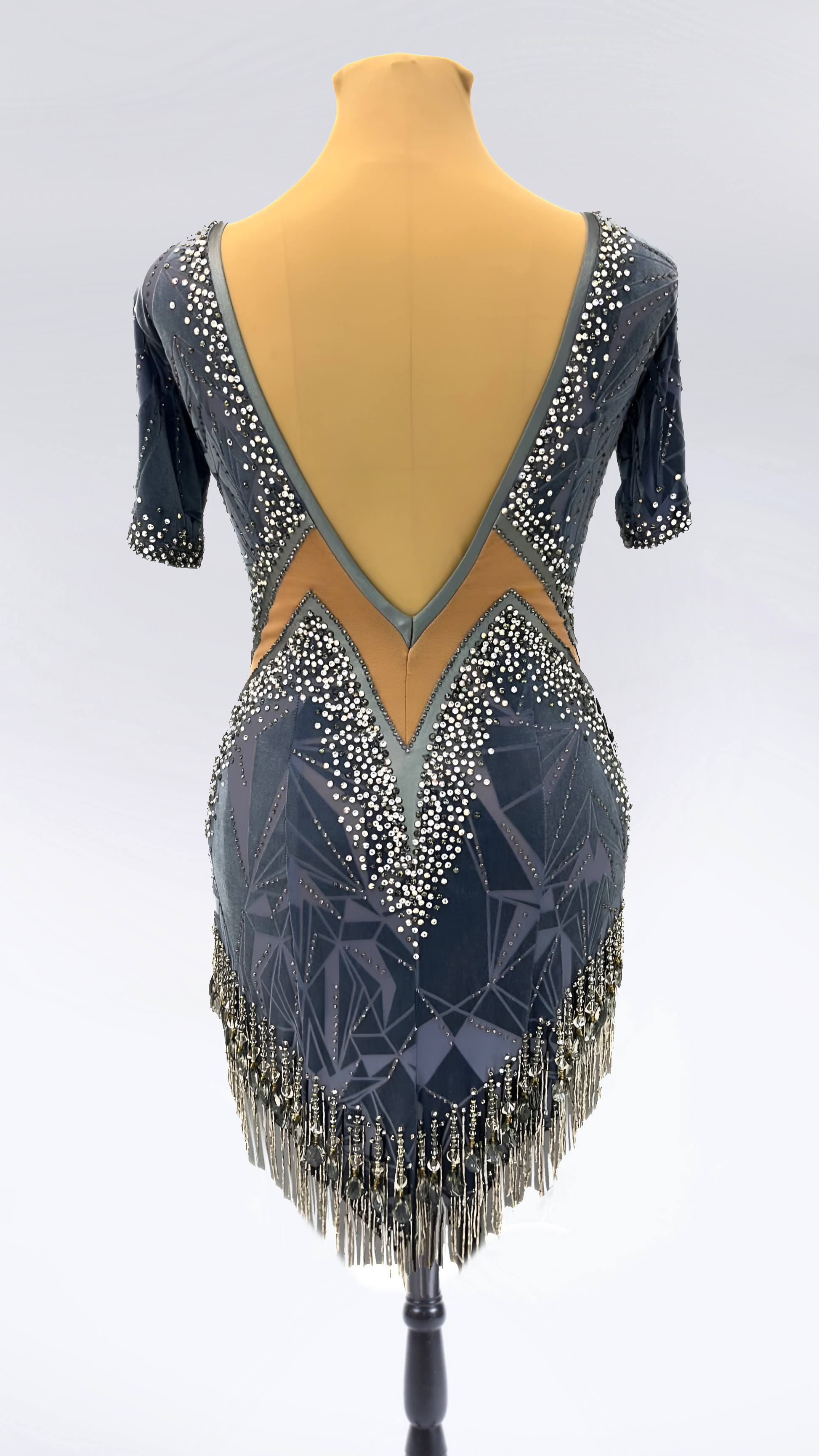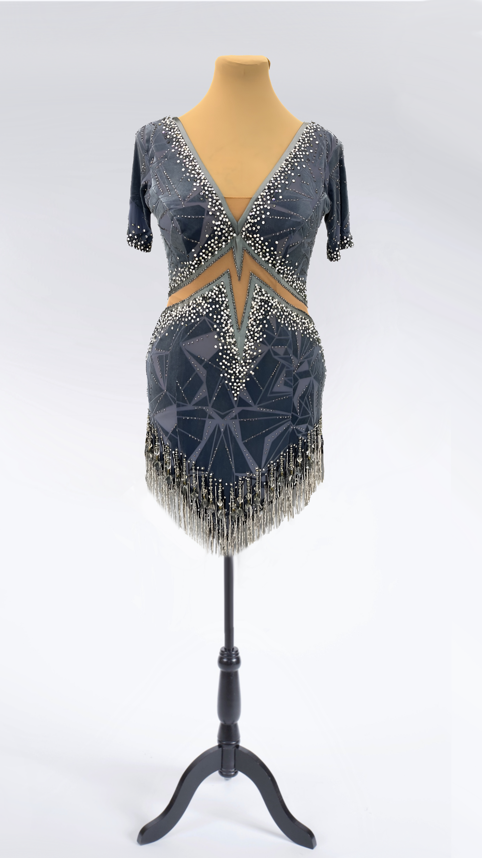 Be a vision in The Chic, a luxe steel blue rhythm ballroom dance gown. Crafted from an abstract laser cut fabric with a plunging neckline, this garment is heavily embellished with sparkling crystals and dazzling beaded fringe. Step out in style and feel like a star.