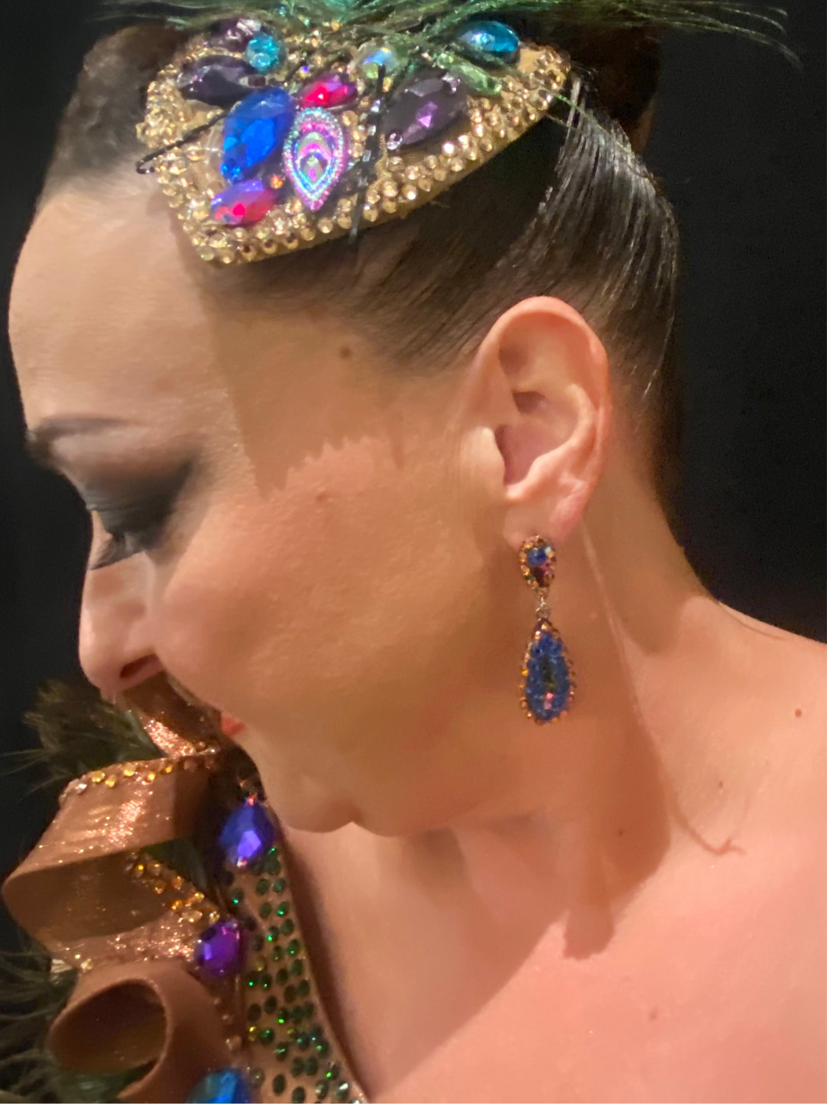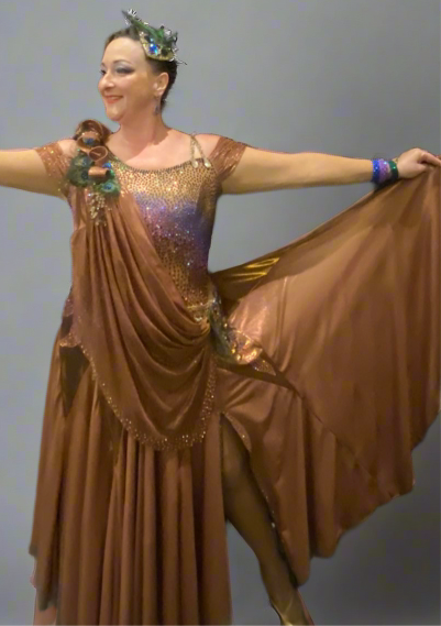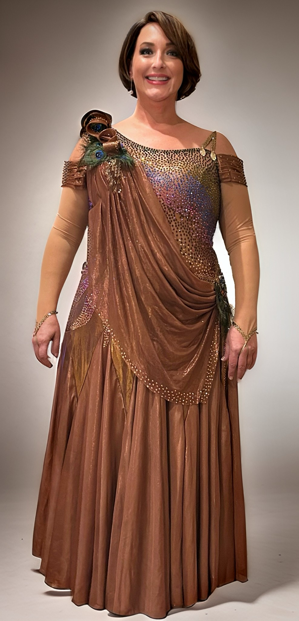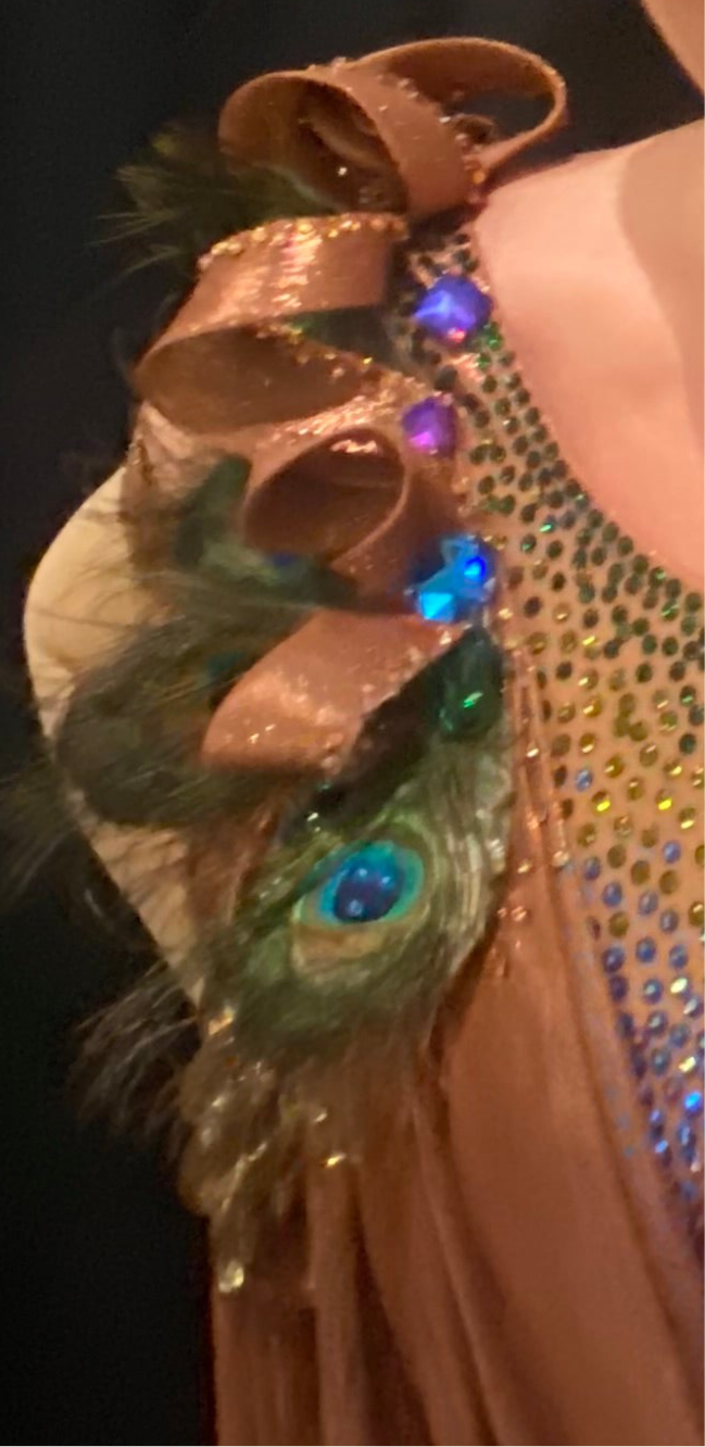 The “Essence of Autumn” gown is a breathtaking embodiment of fall’s splendor, crafted to captivate and inspire. This luxurious masterpiece features a rich, bronze-hued fabric that cascades in graceful, flowing layers, adorned with intricate rhinestone embellishments that shimmer like autumn leaves kissed by sunlight. The elegant off-shoulder design, accented with delicate peacock feather details, exudes regal charm, while the sheer, long sleeves add a touch of ethereal sophistication. Perfect for dancing through the season, this gown transforms every movement into a celebration of nature’s golden harvest, blending timeless elegance with the warm, earthy essence of autumn.