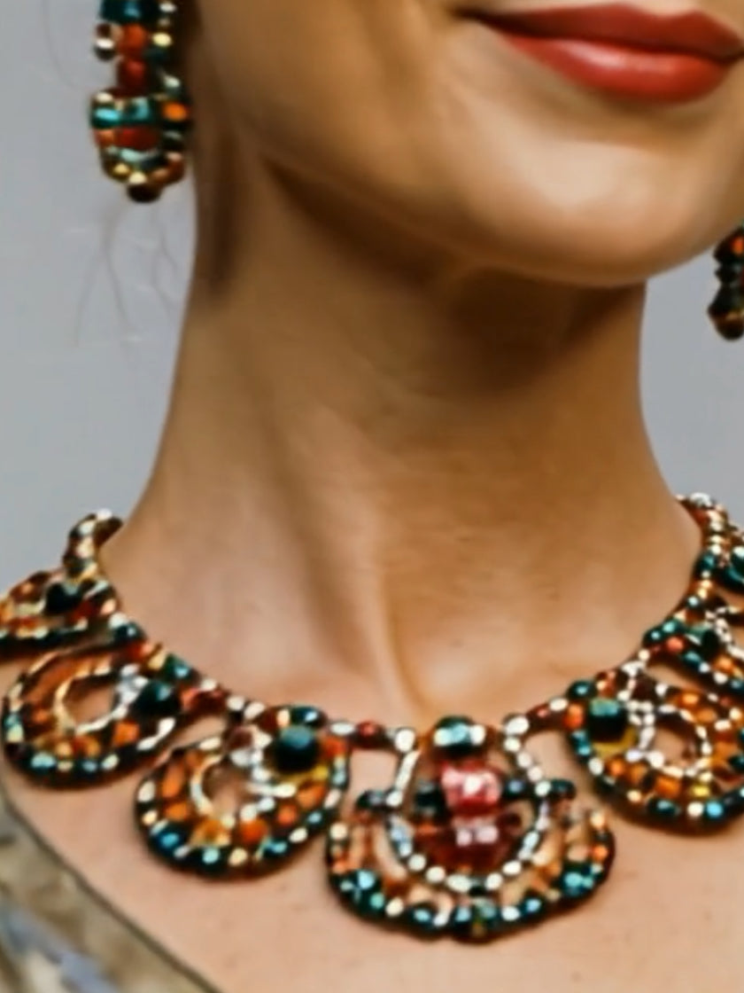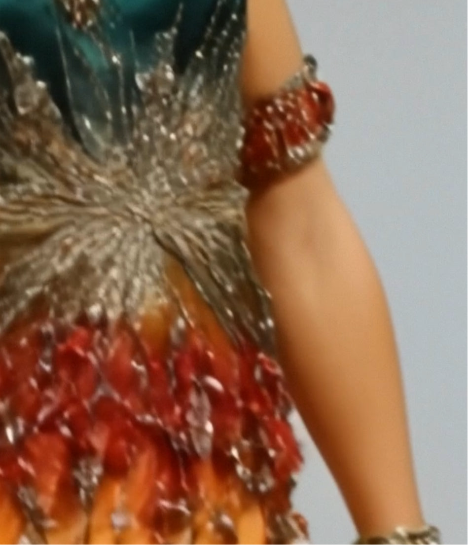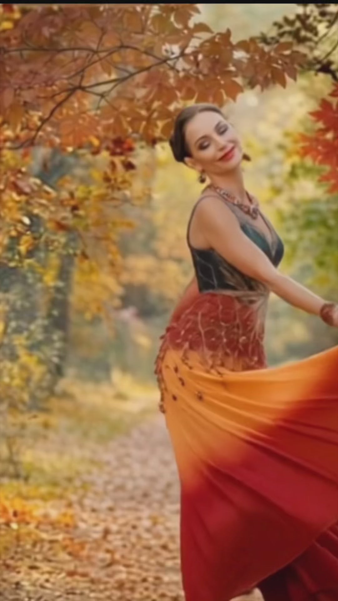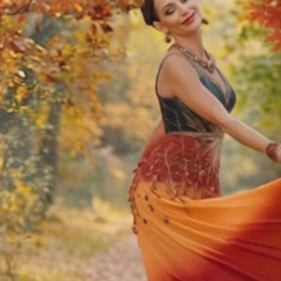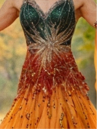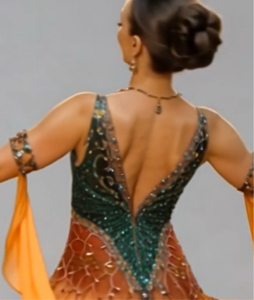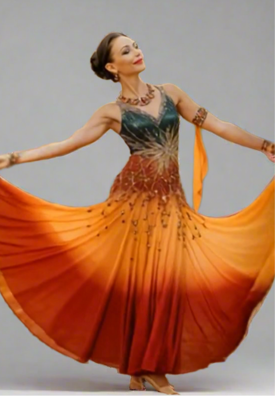 The “Fall Foxtrot” gown embodies the rhythmic grace of autumn’s dance, with its flowing ombre skirt blending fiery orange into deep crimson, evoking the sunset hues of falling leaves. The bodice, accented with intricate green and gold embellishments and a radiant starburst pattern, captures the season’s vibrant energy, while delicate jewelry and armbands add a touch of ethereal flair. Ideal for twirling through competitions or showcases, this lightweight, sequin-adorned masterpiece turns every step into a celebration of fall’s fabulous rhythm and style.