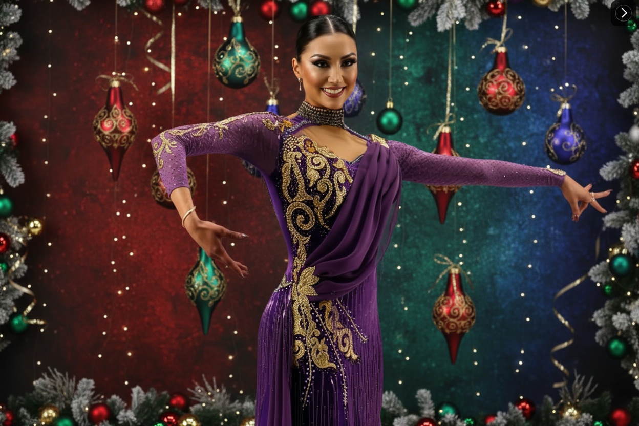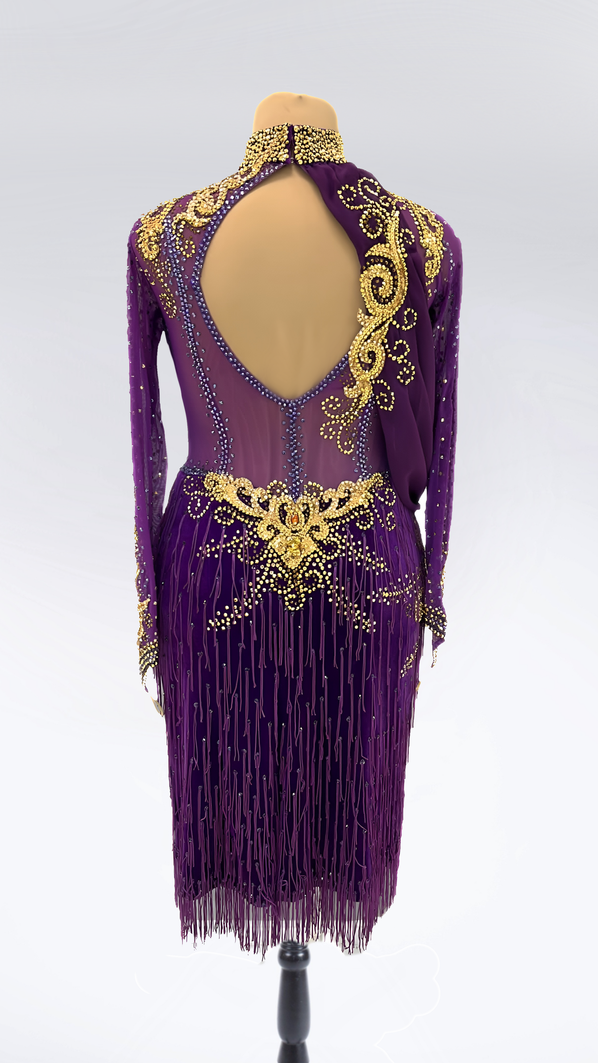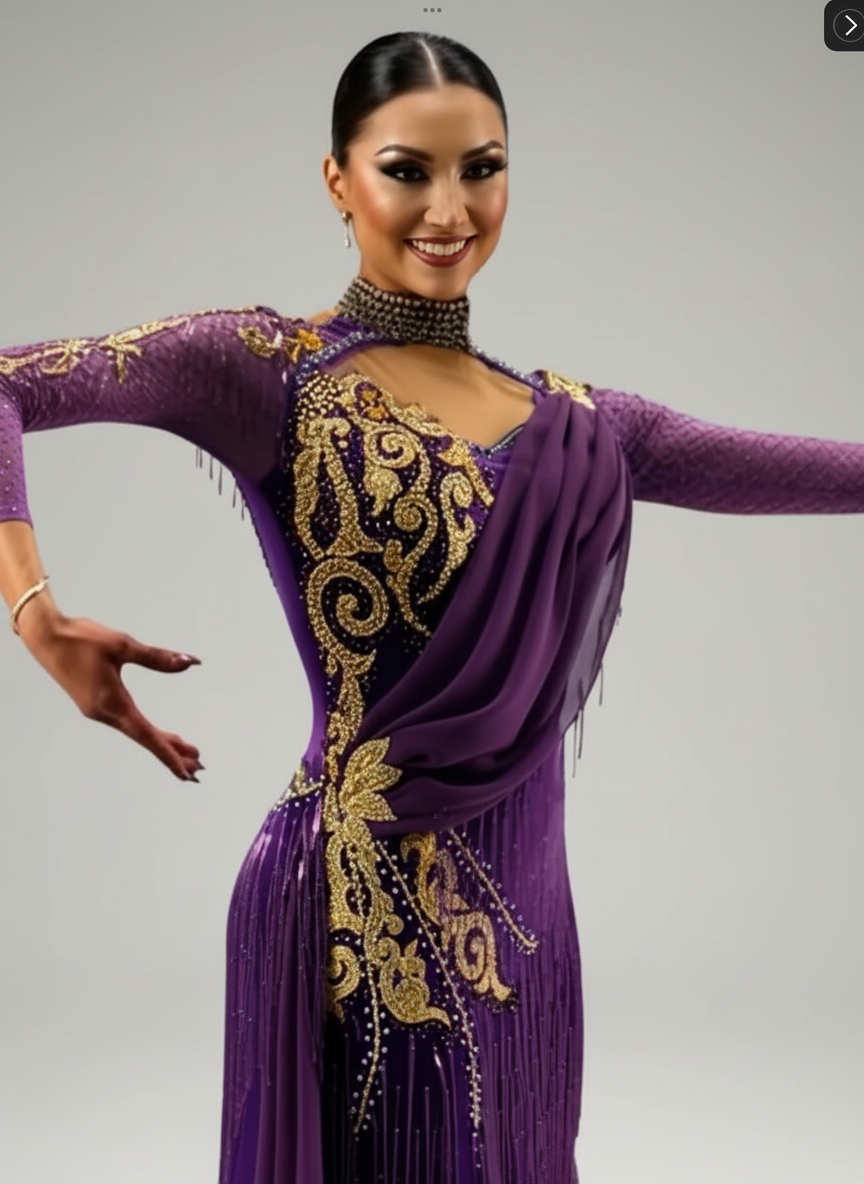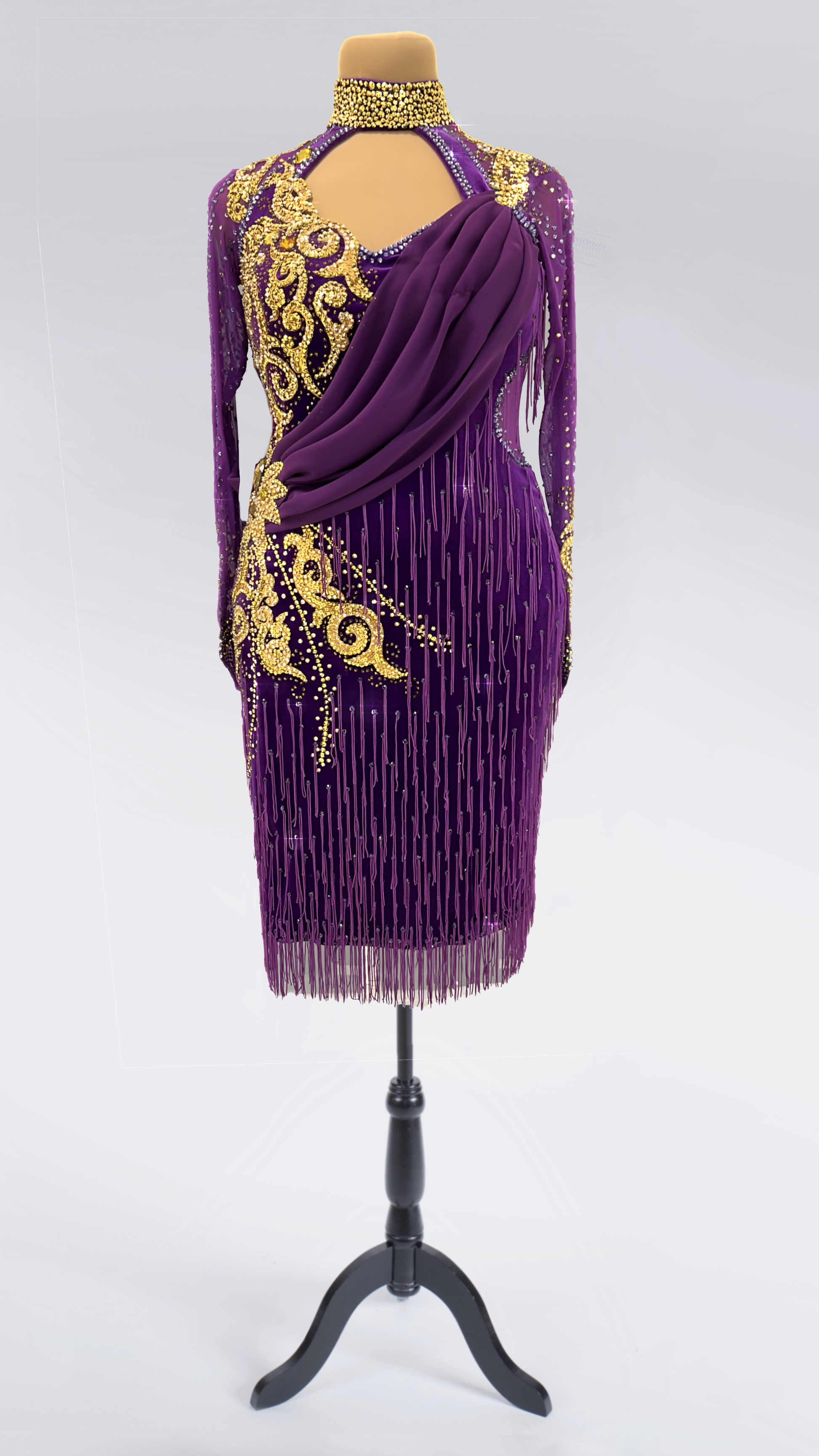 Discover unparalleled elegance and grace with The Posh, a rhythm ballroom dance gown crafted from a luxurious plush purple fabric complemented by accents of gold appliqué and individually placed chainette fringe. To top it off, a soft silk chiffon drape and encrusted with glittering crystals in a range of purple and gold tones, culminating in a delicately high neck that meets a sweetheart bust line, all artfully framed by sheer mesh sleeves. Experience the ultimate in refinement and poise.