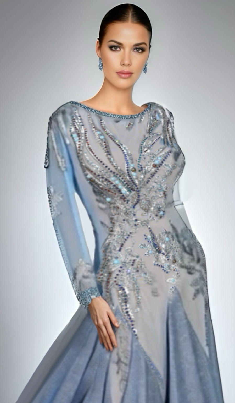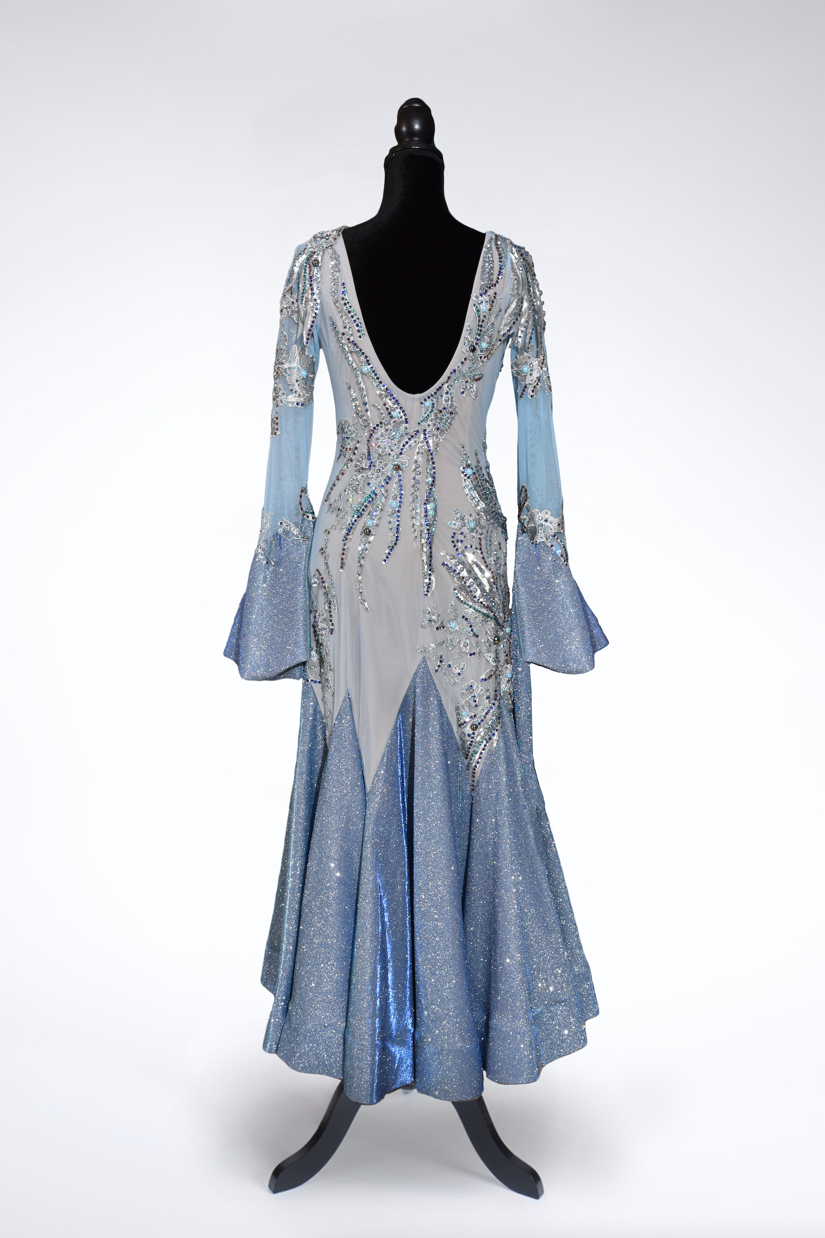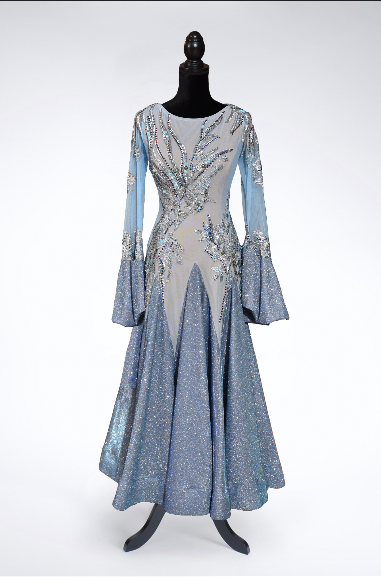 Whimsical Wizard is designed for the enchanting elegance of American Smooth Waltz and Foxtrot. This captivating gown features a soft blue and grey palette, adorned with intricate, entrancing appliques that highlight the bodice and long sleeves. Originally featuring bell sleeves, we’ve tapered them for a more youthful look, enhancing the gown’s slimming silhouette and modern appeal. The balanced blend of delicate embellishments and strong structural details exudes sophistication. Perfect for dancers seeking a magical and refined presence.